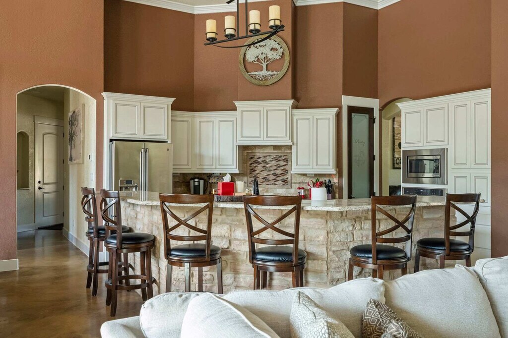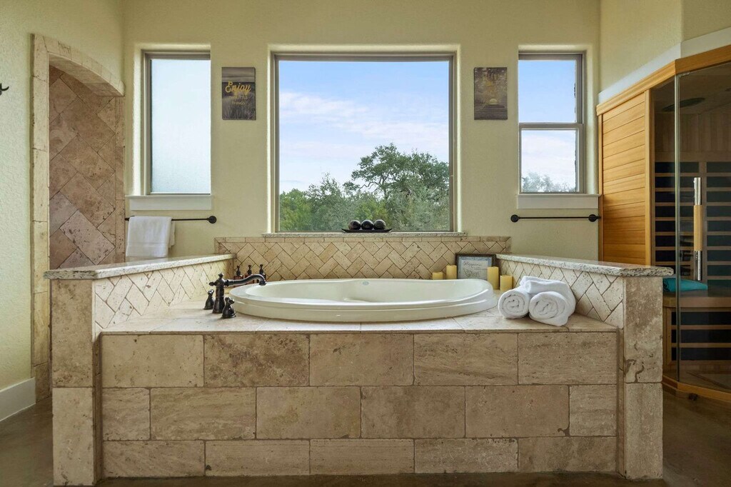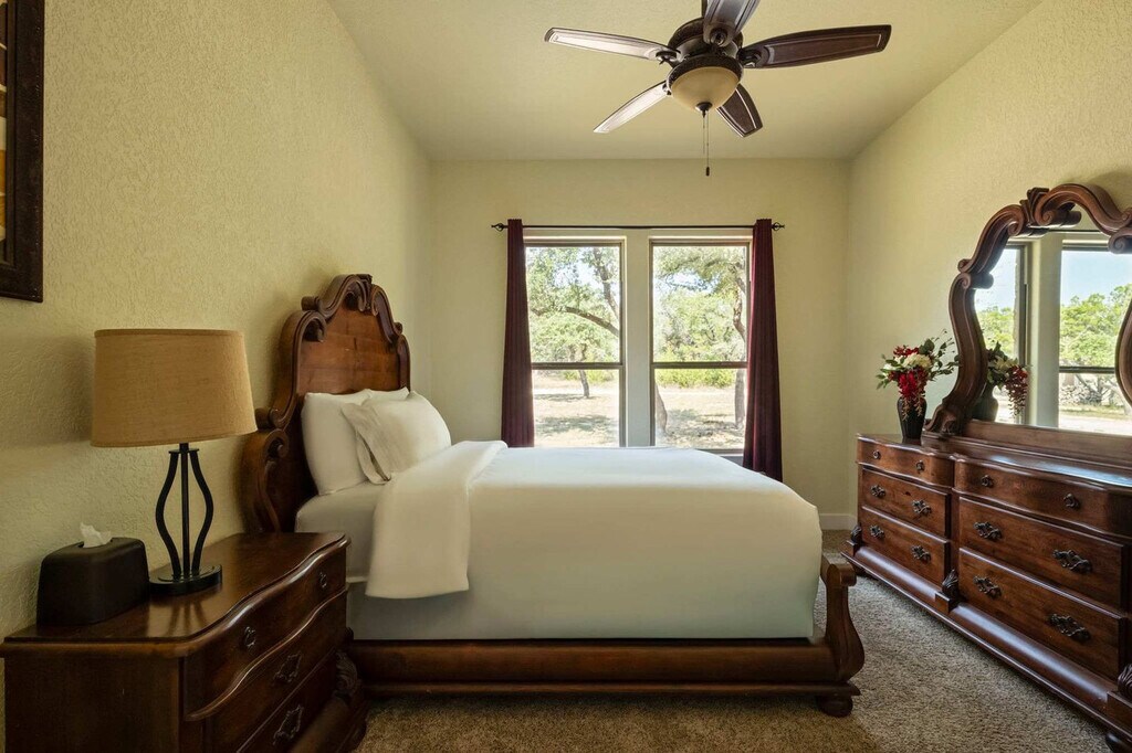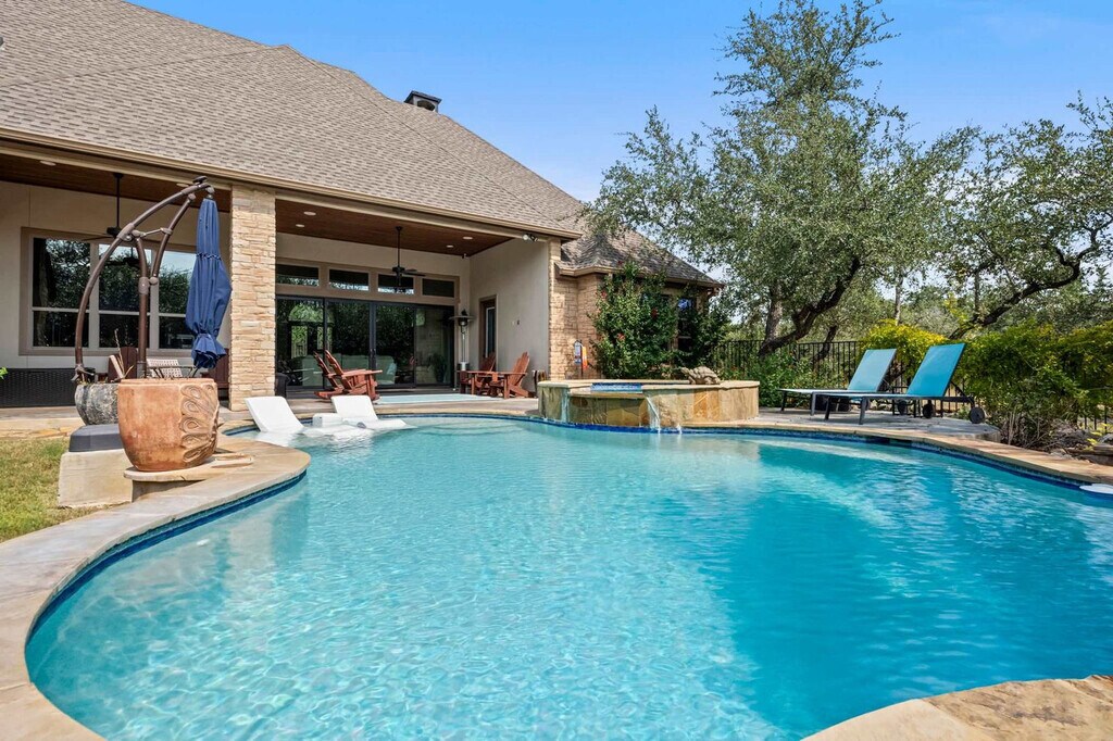 Escape to this serene Wimberley estate with sweeping views where you'll feel at home. This custom home features 4 spacious bedrooms and 4 full bathrooms and accommodates up to 8 guests. This stunning home combines the tranquility of country living with luxurious modern amenities. The expansive open floor plan features large windows that fill the home with natural light and provide stunning views of the private outdoor swimming pool and spacious backyard. The chef’s kitchen is a dream come true with a double-tier island, commercial-grade appliances, and custom cabinetry. For entertainment, the media room features an 85” TV and built-in surround sound, complemented by a full wet bar. Step outside and fire up the gas barbecue grill for a true alfresco dining experience. The spa-like primary suite includes a sauna and Jacuzzi tub. This home is pet-friendly, with a $100 fee per pet, and offers driveway parking for 4–6 vehicles. Early check-in and late check-out are possible, subject to availability and with an associated fee. Enjoy the best of Wimberley living in the Mustang Valley community! Amenities include a private pavilion, playground, sports courts for basketball, tennis, and pickleball, and a private 9-acre lake perfect for fishing or relaxing along the scenic shorelines. Just minutes away, explore Wimberley’s charming town square and shopping district, with easy access to Austin and San Antonio. Quiet hours are from 10 PM to 7 AM. If any furniture is moved, please place it back in the original space where it was found. Additional charges, including shipping fees, may apply if personal items are left behind. If you need to use the hard key, please place it back in the lockbox before departing; failure to return any keys used to the lockbox will result in a $50 replacement fee per key. Tampering with the pool and equipment could incur an additional fee up to $1,000 to cover any damages caused. For health, safety, and maintenance reasons, pets are strictly prohibited from entering the pool; a $500 fine will be charged if this rule is violated. The minimum smoking fee is $250; however, the total charge may be higher if the property's condition renders it temporarily unrentable. Failure to clean and turn off the propane barbecue grill after use will result in a fee. Please do not set the home's thermostat above 76 (heating) or below 68 (cooling); to avoid overloading the system, adjust the thermostat by no more than 2 degrees per hour and keep the doors and windows closed as much as possible. There are exterior cameras at the property for security purposes; please do not tamper with them. [SI]