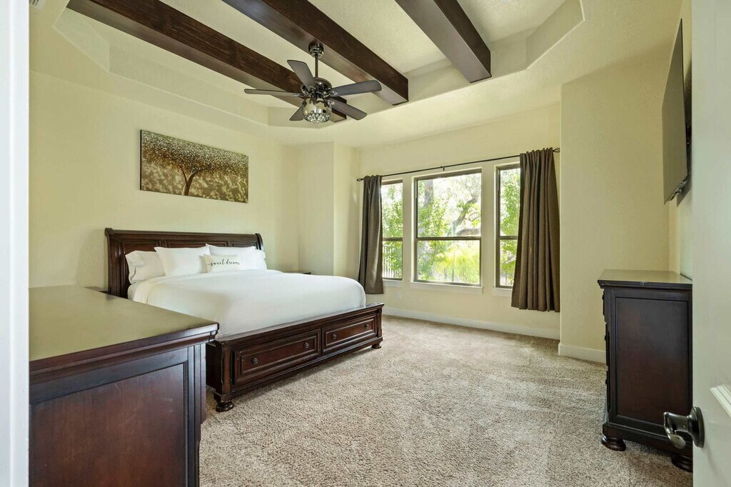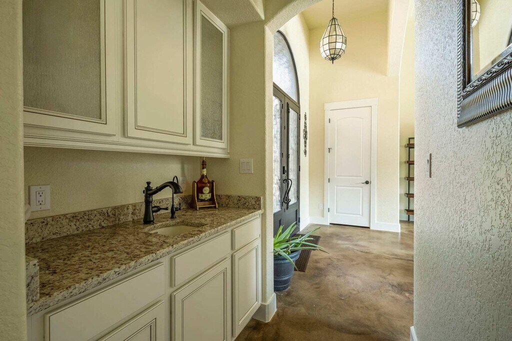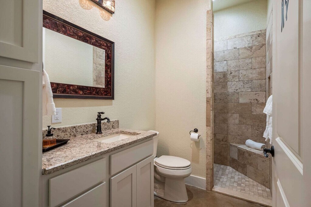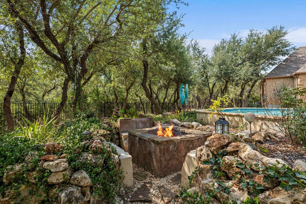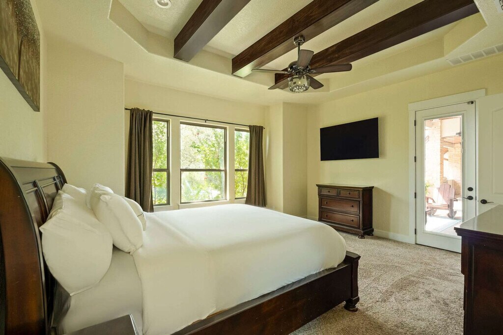 Escape to this serene Wimberley estate with sweeping views where you'll feel at home. This custom home features 4 spacious bedrooms and 4 full bathrooms and accommodates up to 8 guests. This stunning home combines the tranquility of country living with luxurious modern amenities. The expansive open floor plan features large windows that fill the home with natural light and provide stunning views of the private outdoor swimming pool and spacious backyard. The chef’s kitchen is a dream come true with a double-tier island, commercial-grade appliances, and custom cabinetry. For entertainment, the media room features an 85” TV and built-in surround sound, complemented by a full wet bar. Step outside and fire up the gas barbecue grill for a true alfresco dining experience. The spa-like primary suite includes a sauna and Jacuzzi tub. This home is pet-friendly, with a $100 fee per pet, and offers driveway parking for 4–6 vehicles. Early check-in and late check-out are possible, subject to availability and with an associated fee. Enjoy the best of Wimberley living in the Mustang Valley community! Amenities include a private pavilion, playground, sports courts for basketball, tennis, and pickleball, and a private 9-acre lake perfect for fishing or relaxing along the scenic shorelines. Just minutes away, explore Wimberley’s charming town square and shopping district, with easy access to Austin and San Antonio. Quiet hours are from 10 PM to 7 AM. If any furniture is moved, please place it back in the original space where it was found. Additional charges, including shipping fees, may apply if personal items are left behind. If you need to use the hard key, please place it back in the lockbox before departing; failure to return any keys used to the lockbox will result in a $50 replacement fee per key. Tampering with the pool and equipment could incur an additional fee up to $1,000 to cover any damages caused. For health, safety, and maintenance reasons, pets are strictly prohibited from entering the pool; a $500 fine will be charged if this rule is violated. The minimum smoking fee is $250; however, the total charge may be higher if the property's condition renders it temporarily unrentable. Failure to clean and turn off the propane barbecue grill after use will result in a fee. Please do not set the home's thermostat above 76 (heating) or below 68 (cooling); to avoid overloading the system, adjust the thermostat by no more than 2 degrees per hour and keep the doors and windows closed as much as possible. There are exterior cameras at the property for security purposes; please do not tamper with them. [SI]