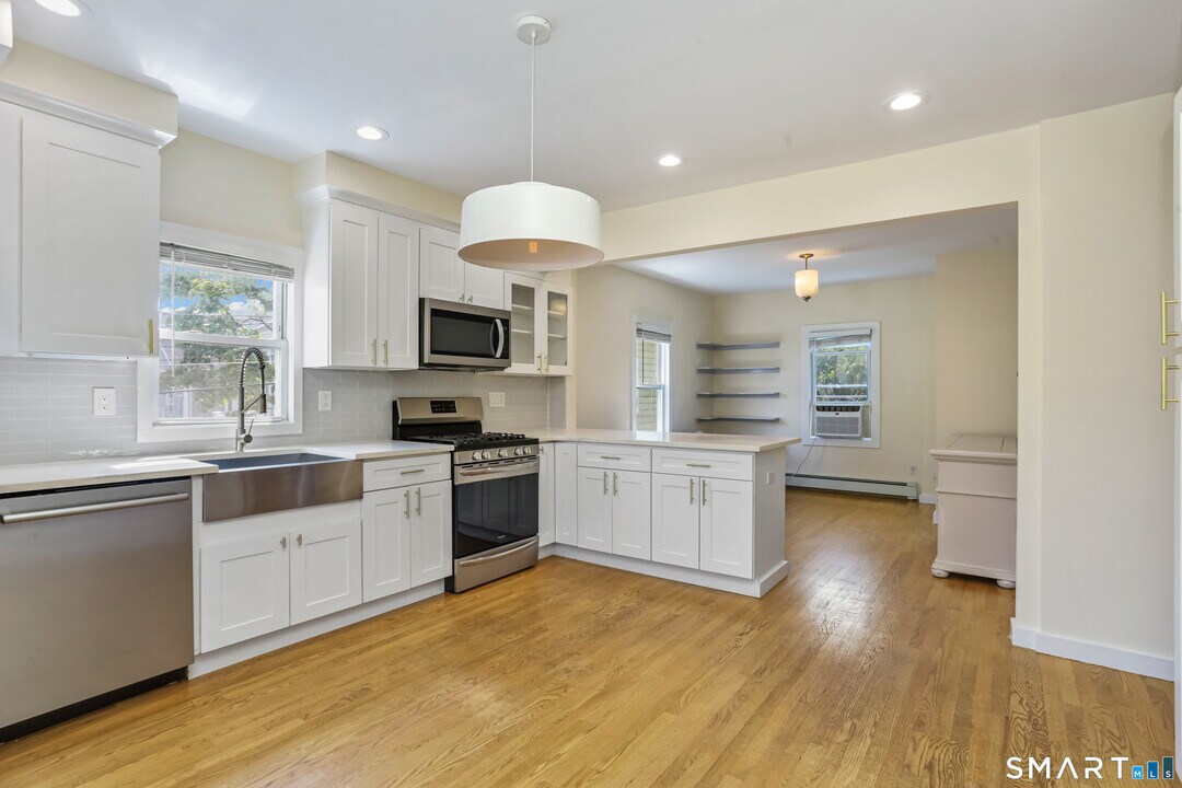 Call for Availability - ALL UTILITIES INCLUDED (Gas, Electric, Water) WiFi not included. This 700sf second floor one bedroom, one bath home was fully renovated in 2016. The spacious open living room enjoys south western exposures/views and is adjacent to the new eat-in kitchen with stainless steel appliances and quartz counter tops. The fully renovated bathroom features marble and quartz tile. The bedroom offers generous closet space including a large walk-in as well as room for your home office. A larger outdoor terrace, in-unit washer and dryer and ample off street parking complete this offering. MLS# 24169431