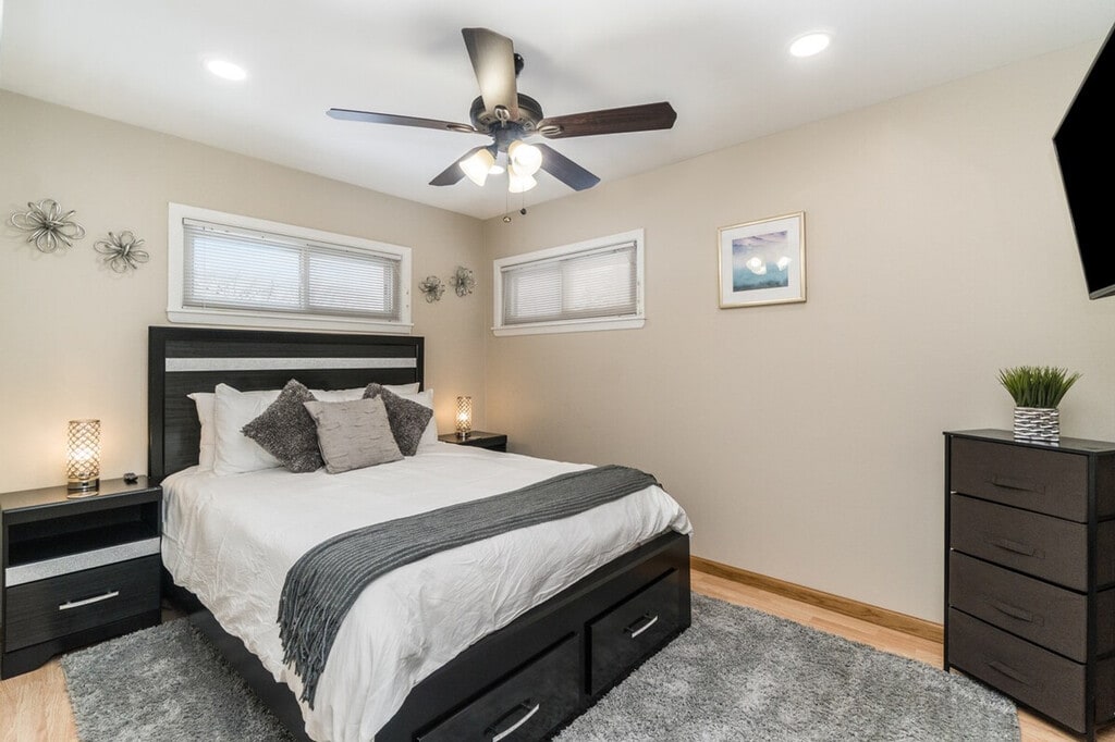 Feel at home in this renovated 1400 sq ft unit, located 7-9 minutes from Interstate 90, providing easy access to O'Hare Airport and downtown. This home features 3 bedrooms and 2 full bathrooms. This single-family home includes a 1-car garage and street parking. The kitchen is fully equipped with utensils, cooking spices, and oils. For entertainment, there are 4 LCD televisions with access to Hulu, Disney, and ESPN streaming services in English and Spanish, as well as Netflix and Prime Video access using your own login. Enjoy up to 300 MBPS internet speed with Wi-Fi throughout the entire home and an available ethernet hard line. The living area has a 55" TV and the bedrooms each have a 40" TV. A sound bar is available in the living room. For family fun, there are cards and over 50 board games on site. Also included are a pack & play sleeper, a stroller, a high chair, and a booster seat. Parking is available in the 1-car garage and on the street. The apartment is children friendly and includes lots of technology. If the home has a fireplace, it is not for guest use. [SI]