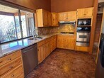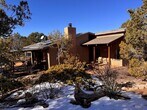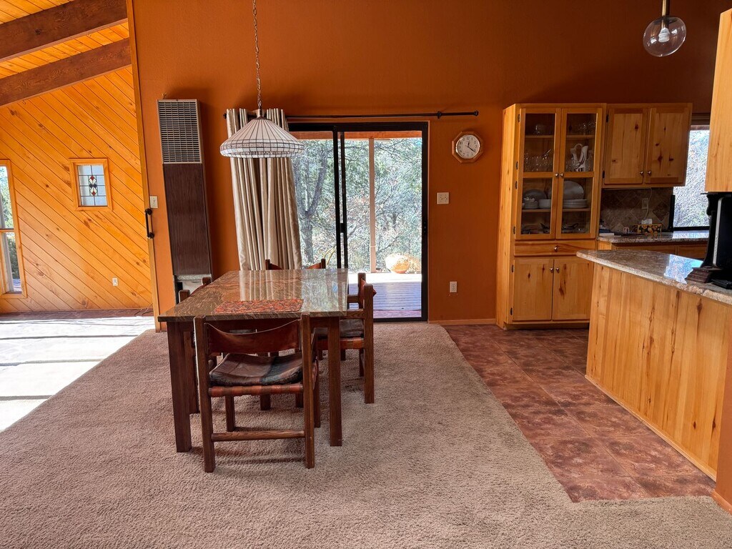 Woodsey and Wow is a perfect description for this house. On nearly 5 wooded fenced acres and wrapped with open and covered decks there’s plenty of outdoor enjoyment. Soaring wood and beamed ceilings and warm wood paneling surround a stone fireplace in the living room. Sunroom with stone flooring is perfect for an interior green space. Granite counter tops and lots of custom cabinetry in the kitchen. Matching dining table and leather chairs included. Three bedrooms and 2 updated bathrooms. Solar assisted heating, propane wall furnaces, evaporative cooling. Two car garage and a large shed. Call Liz to see if this rare find is a fit for you, .