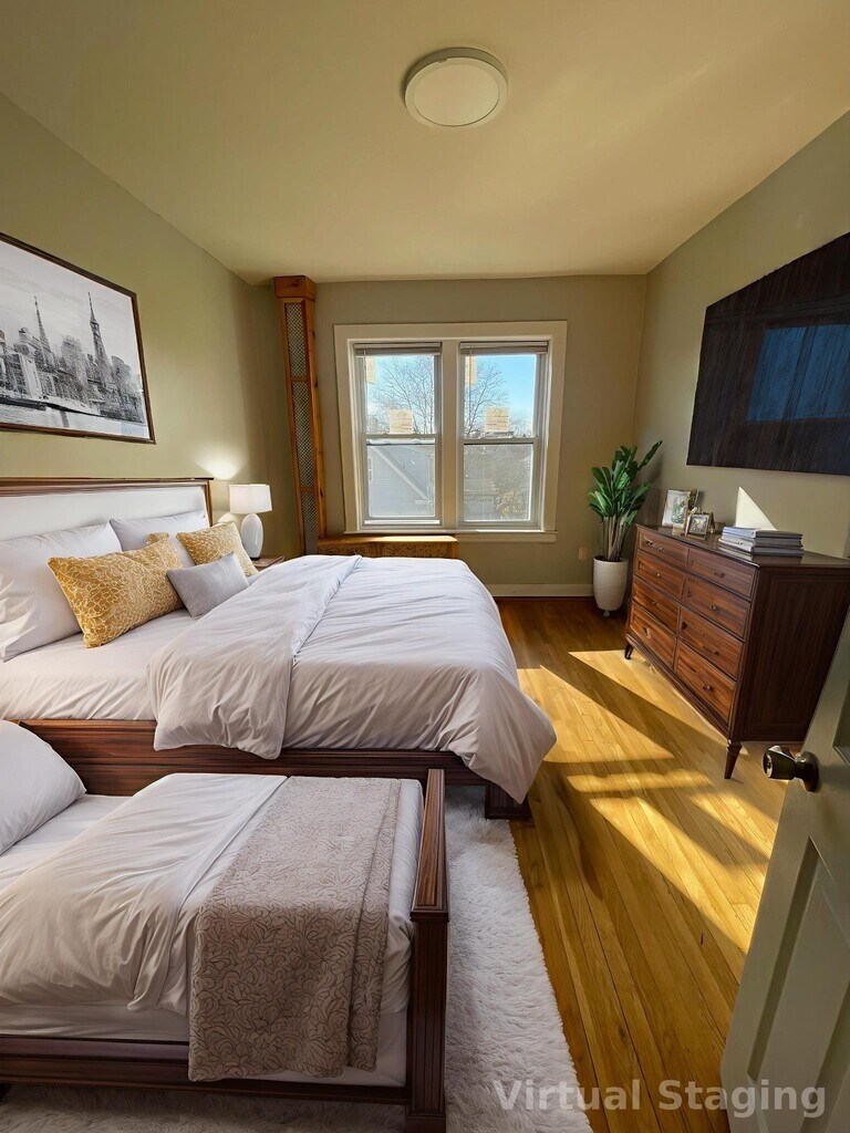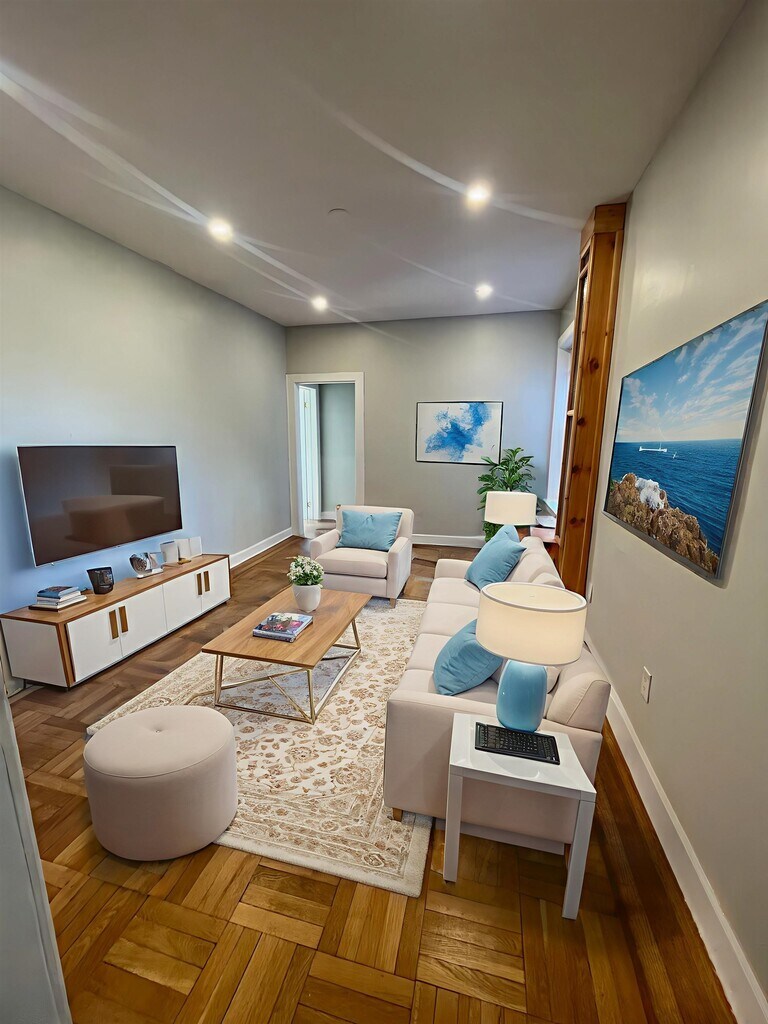 Oversized 1-Bedroom Across from the Park – On The Park Condominium Welcome home to this bright, oversized one-bedroom at On The Park Condominium, 120-122 W 39th St in North Bayonne. Perched just across the street from beautiful Stephen R. Gregg / Hudson County Park, this condo brings together space, light, and an unbeatable parkfront location. The apartment features a generous living room with classic hardwood floors, a large king-size bedroom, and a separate, updated kitchen with sleek tile flooring, stainless steel refrigerator, modern cabinets, and plenty of counter space. The windowed bathroom has been refreshed with contemporary tile, a clean white vanity, and tub/shower combination. A deep, cedar-style closet and additional hallway storage make organizing easy. Apartment highlights • Extra-large 1BR layout – feels more like a junior 2BR • Sunny living room with virtual staging shown for furniture ideas • King-size bedroom with great light and hardwood floors • Updated eat-in kitchen with modern tile and stainless-steel fridge • Renovated, windowed bathroom • Deep interior closet plus additional hallway storage • Well-maintained condo building Building & neighborhood • On The Park Condominium – clean, quiet, well-kept building with intercom, basement laundry (coin-op) and exercise room • Directly across from Stephen R. Gregg Park / Hudson County Park with walking/bike paths, waterfront views, playgrounds, sports fields, and dog area • Easy access to Bayonne’s local restaurants, cafés, and mom-and-pop shops along Broadway, plus nearby supermarkets and everyday conveniences • Convenient to Bayonne Bridge, Route 440, and Light Rail options for commuting to Jersey City and NYC