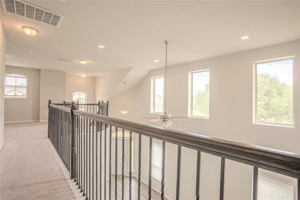 Tucked at the end of a cul-de-sac in booming Leander, this home offers added privacy with no direct neighbor on one side—bordering the community clubhouse with a pool on the other. Inside, soaring ceilings and an open-concept layout create an inviting space for both everyday living and entertaining, with a main-level primary suite featuring a walk-in closet, dual vanities, and a spacious walk-in shower. A versatile upstairs bonus room overlooks the living area below, perfect for a game room, office, or second living space. Enjoy a private, oversized backyard and quick access to 183, with a short drive to Georgetown and downtown Austin. MLS ID 6570527