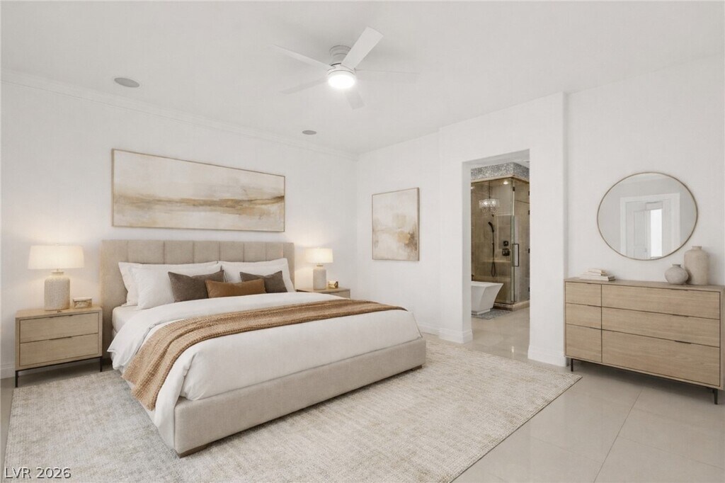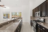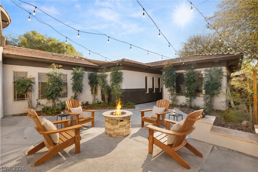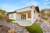 Beautifully appointed 3-bedroom, 3-bath residence featuring a private casita with separate entrance—ideal for guests or multigenerational living. The entrance to the courtyard is a striking solid wood door, opening to a serene setting with fountain and firepit seating area. Contemporary finishes include porcelain flooring and a spacious great room with sliding glass doors to both courtyard and backyard for seamless indoor-outdoor living. Renovated island kitchen offers breakfast bar, granite countertops, and stainless steel appliances. Updated bathrooms throughout, including a modern primary suite with freestanding soaking tub and separate walk-in shower. Covered patio with built-in BBQ and low-maintenance desert landscaping with riverbed design.