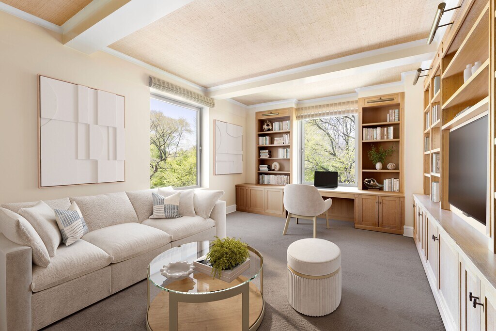 EXCEPTIONAL VALUE ON FIFTH AVENUE! With the three main public rooms directly facing Central Park, this sprawling 4-5 bedroom home is only $1,300 per square foot, making it the best deal in the neighborhood. Stunning Central Park views over Fifth Avenue, spectacular sunlight, and a gracious layout on a grand scale define this breathtakingly beautiful 3,700+ sq ft, one-of-a-kind residence in a rare pre-war Emery Roth condominium on Museum Mile. With majestic Central Park as its backdrop through new tilt and turn picture windows and boasting an exceptional 39 linear feet directly on Fifth Avenue, experience the magic of New York City’s changing seasons from any one of the three principal rooms facing the park. The private elevator vestibule opens on to an impressive gallery with lovely travertine limestone floors flowing graciously into the wonderfully proportioned living room framed by show-stopping Central Park trees engulfing oversized windows and beamed ceilings. The living room sits adjacent to the elegant formal dining room, also with direct park views and adjoining the perfectly appointed eat-in kitchen, a chef’s dream with sleekcustom cabinetry, quartz stone countertops, enviable pantry storage, banquette seating for 6-8, breakfast bar, and top-of-the-line appliances including a 48” Sub-Zero refrigerator/freezer, Wolf 6-burner vented range, a second Wolf wall oven, Wolf microwave and warming drawer, Gaggenau steam oven, Miele dishwasher, and a butler’s pantry with a Sub-Zero wine cooler, an additional sink, and an appliance garage. The sundrenched and grand corner library, finished in artfully designed cerused oak paneled bookshelves and desk, boasts southern and western exposures into Central Park and an ensuite full bathroom, offering versatile use of space, perfect also as a guest bedroom or a fifth bedroom. The dramatic bedroom corridor is lined with enviably large closets and offers privacy and separation from the public space. The double-sized primary bedroom is an urban sanctuary, featuring both oblique Central Park views as well as sunny southern exposures and a huge ensuite bathroom with double vanity, tub, and separate glass stall shower. Two generously sized south-facing bedrooms share a renovated bathroom and the fourth occupies a corner at the end of the hall with open views facing north and an ensuite bathroom with tub shower. There is a bonus room currently set up as an office, but which could easily function as a media room or an additional guest room. Finally, there is a windowed laundry room, the size of which is rarely seen in a city apartment, featuring an oversized Electrolux washer and vented dryer, a second Sub-Zero fridge and freezer, custom cabinetry and storage, and a wall of windows. Rounding out this special home is an astounding 13 closets, most outfitted by California Closets, multi-zone heating and cooling, Sonos sound system, Lutron lighting, and classic architectural details. The residence has been freshly repainted, ready for you to move right in. A private storage unit conveys with the apartment. Nestled among world-famous museums, educational and cultural centers, restaurants, shopping, and multiple modes of transportation, this exceptional full-service luxury condominium, representing the best of the renowned architect Emery Roth, is a rarity on Fifth Avenue and sits moments from the Conservancy Gardens and the reimaged Harlem Meer and Lasker Rink, the capstone project of the Conservancy’s 40-year campaign to restore Central Park. Building amenities include a 24-hour doorman, bike room, laundry room, private storage room, walk-in storage refrigerator, state-of-the-art fitness center and a live-in superintendent. Pets are case by case. This gorgeous apartment truly feels like a home! Rental Terms: Monthly: $23,500