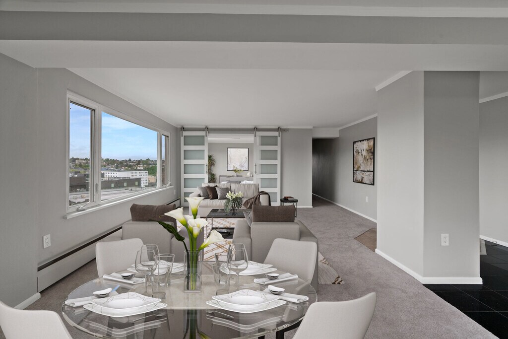 Welcome to urban living at its finest! This exquisite 2 bedroom and 1.75 bathroom penthouse flooded with natural light, expansive living/dining rm perfect for relaxation or entertaining. Enjoy two large private outdoor terraces perfect for entertaining, gardening, or just taking in the Seattle Skyline. Renovated master bedroom maximizes views. Two gated parking spots. Laundry in unit. Solid concrete/steel building – very quiet. The building is located at the vibrant intersection of First Hill and Capitol Hill. Unparalleled wrap-around vistas of downtown - Space Needle, Lake Union, Cascades & more! Walk to Pike/Pine, Broadway & Seattle's Best. Easy access to Public Transit and freeways.