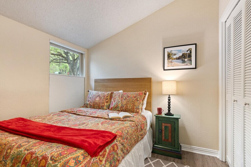 Feel at home in this charming two-bedroom apartment located just 0.33 miles from Zilker Park and Barton Springs Pool. With floor-to-ceiling windows in the living room, enjoy waking up to the sun shining through as you sip your morning coffee. This apartment features a "Hollywood" bathroom with a second sink/vanity in the master bedroom, and offers a cozy covered patio for fresh air and relaxation. The apartment is perfect for a family or up to three couples, featuring a king-size bed in the master bedroom and a full-size bed in the second bedroom. The fully equipped kitchen includes essentials like a coffee maker, coffee grinder, electric water boiler, toaster, blender, cookware, silverware, ceramic and plastic dishes, a four-burner stove, oven, microwave, and even a press pot. Additional kitchen appliances such as an instant pot, popcorn popper, waffle iron, and hand mixer are available upon request. Other amenities include beach towels for Barton Springs, an iron and ironing board, hair dryer, extra bath towels and linens, Roku HD TV with antenna for local channels, board games, high-speed internet, and basic bathroom essentials. Pets are welcome with a fee of $50 for shorter stays and $100 for monthly stays. The apartment includes two off-street reserved parking spaces. Crates, gates, and couch covers for pets are available upon request. A cleaning fee of $115 applies for shorter stays and $200 for stays of 30 days or more. Nestled in the vibrant Zilker neighborhood, this apartment offers easy access to local attractions. Just a few blocks away, you'll find Zilker Park, Lady Bird Lake, the Hike and Bike Trail, and the back entrance to Barton Springs Pool. Downtown Austin is only two miles away, making it convenient to explore the city's lively scene. The City of Austin enforces a 10:30 PM noise curfew, and a second complaint may result in immediate eviction without refund. Smoking or vaping is only allowed outside using the provided ashtray. Check-in is contactless with a keyless deadbolt. Weekly discounts do not apply to SXSW bookings. [SI]
