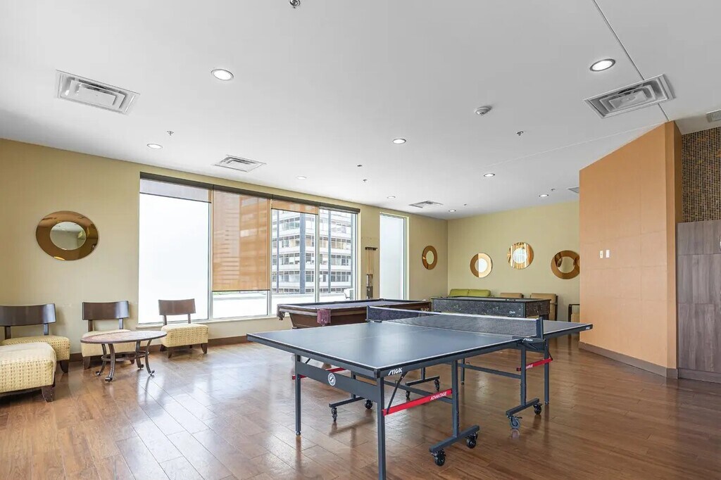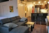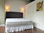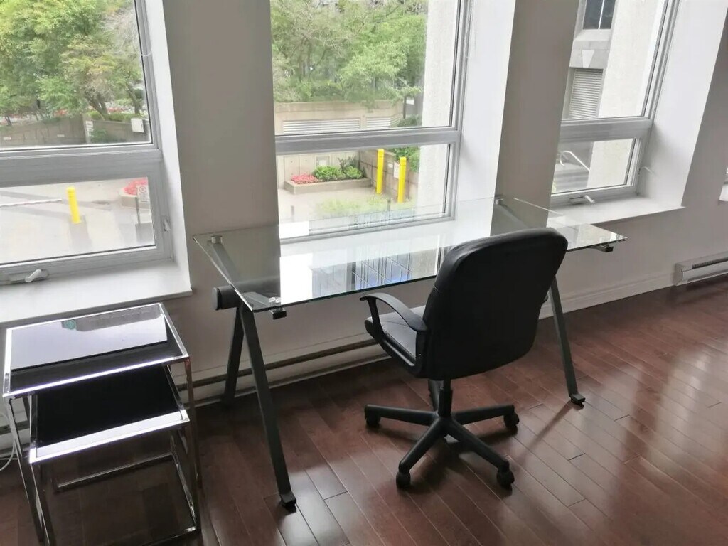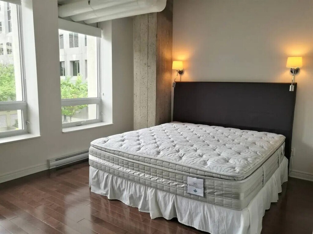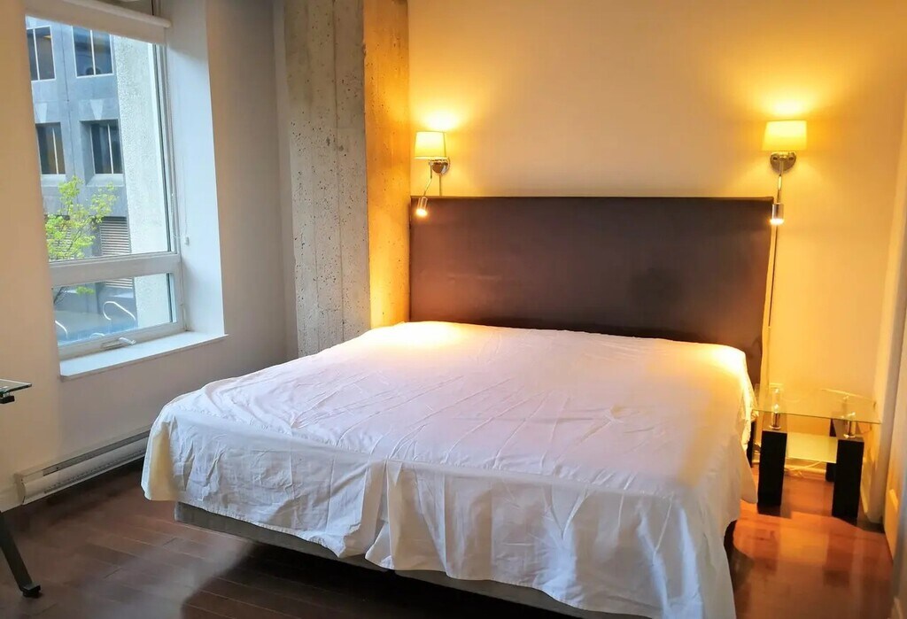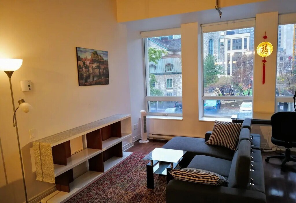 If you are looking for a unit that is unique, comfy, cozy and convenient, then this one will not let you down. It is available on April 1st, 2026! This loft style unit is centrally located on a quiet street in downtown Montreal between Saint-Catherine Street & René-Lévesque Boulevard. It is close to stores, shops, restaurants, bars, China Town, Old Port, public transit and government service buildings. Walk Score is 98! It takes 1 minute walk to Pharmaprix, 2 minute to Best Buy & Dollarama, 5 minute to Complex Desjardins, IGA, Eaton Centre, Place-des-Arts & Square Victoria-OACI Metro Station, 10 minutes walk to McGill University, UQAM …… The condo unit is fully furnished with 4 large bay windows, 12' high ceiling, hardwood flooring throughout, comes with 1 King Size bed, smart TV, Air Conditioning, stainless steel fridge, stove and Dishwasher, granite countertop, washer and dryer, glass shower and large walk-in closet. Unit is facing an outdoor mini soccer field & a city historic building. Unlike unit windows facing neighbors' windows, this unit has unobstructed view from all the windows with privacy. It is ideal for young couples, professional or student. Building is equipped with secured access, Door man, onsite management office, rooftop pool and BBQ area, indoor gym, sauna, game room and so much more. Rent is $1650/month. (Electricity and Internet are not included) Please contact Gina for more details.