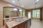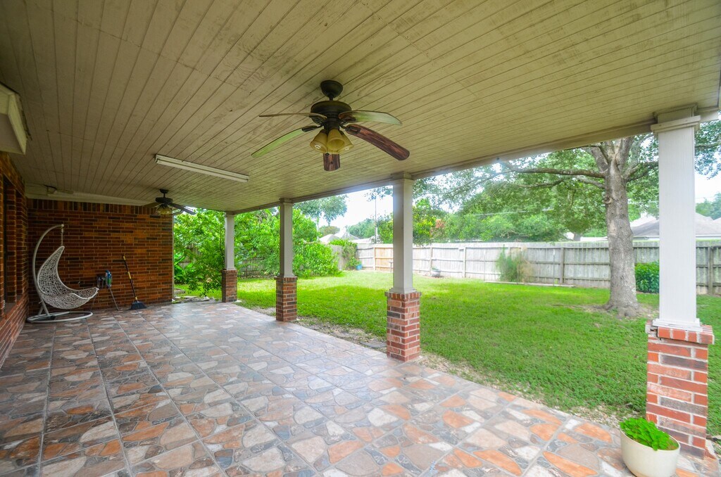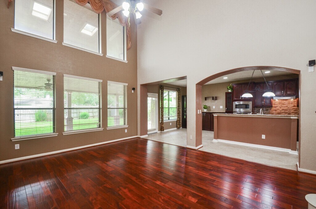 FACES EAST Located in Sugar Land’s sought-after Telfair community,this two-story brick home blends timeless charm with modern comfort. Inside,wood floors,soaring ceilings,and abundant natural light create an inviting atmosphere. The foyer opens to a formal dining room and a versatile space ideal for an office or den. The living area features dramatic two-story windows,a fireplace with custom niches,and open flow into the kitchen and breakfast nook. The kitchen offers ample cabinetry,generous counters,and a raised bar overlooking the living space. A private downstairs suite provides a quiet retreat with views of the backyard. Upstairs includes a spacious game room and additional bedrooms,offering flexibility for daily life. Outdoor living shines with a covered patio and a skylit balcony overlooking a lush,fully fenced yard. Enjoy nearby lakes,trails,and a resort-style pool in one of Sugar Land’s most vibrant neighborhoods. MLS# 18092762