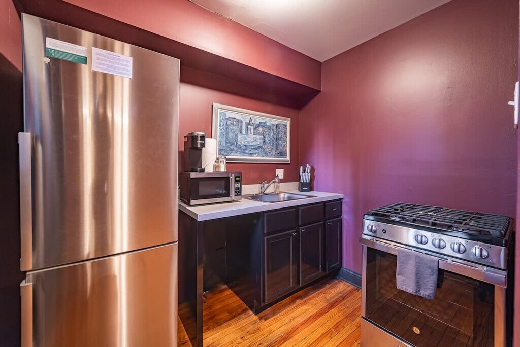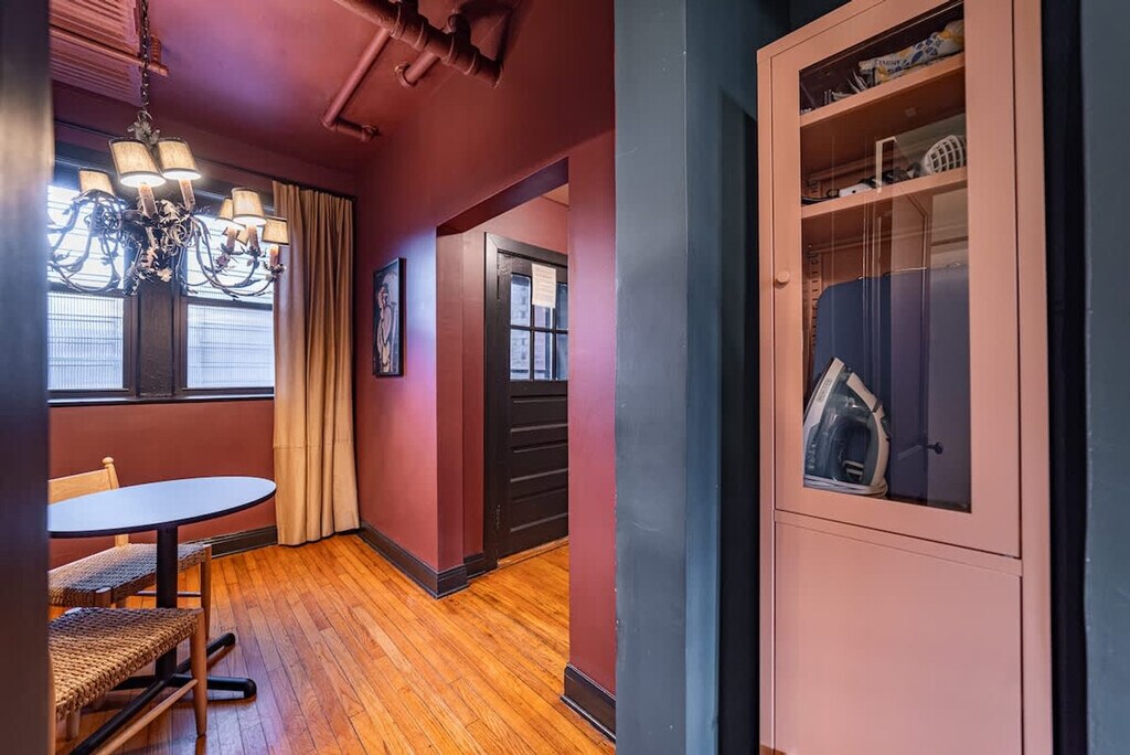 Feel at home in this lovely ground floor apartment, featuring large windows and vintage charm. The apartment is a five-minute walk from Wrigley Field, the Southport shopping corridor, and both the red line and brown line subway stations. This unique apartment includes all the comforts of home while embracing the quirky charm that only a vintage building can offer. It is furnished with art, furniture, and books. Parking isn't included, and the streets around the apartment are either permitted (local residents only) or metered. Using SpotHero to reserve a parking spot nearby is highly recommended. The apartment is centrally located, a short walk away from shops and restaurants. Wrigley Field & Wrigleyville are a 4-minute walk away, the Southport Corridor is a 5-minute walk away, the Music Box Theater is a 10-minute walk away, the Metro Theatre is a 6-minute walk away, Boystown is a 13-minute walk or 5 minutes via public transit, the Lakefront Trail & Belmont Harbor are 8 minutes via public transit or driving, the Lincoln Park Zoo is 20 minutes via public transit or a 12-minute drive, and Downtown is 20 minutes via public transit or a 16-minute drive. The Southport 'L' train stop (Brown line) is an 8-minute walk away, the Addison 'L' train stop (Red/Brown lines) is a 7-minute walk away, O'Hare is 50 minutes via public transit or ~35 minutes driving, and Midway is 65 minutes via public transit or ~45 minutes driving. Because the apartment is located in a 100+ year-old urban building on the ground floor, you may occasionally find an errant cobweb or two, and you may occasionally hear some noise from neighbors or passersby. [SI]