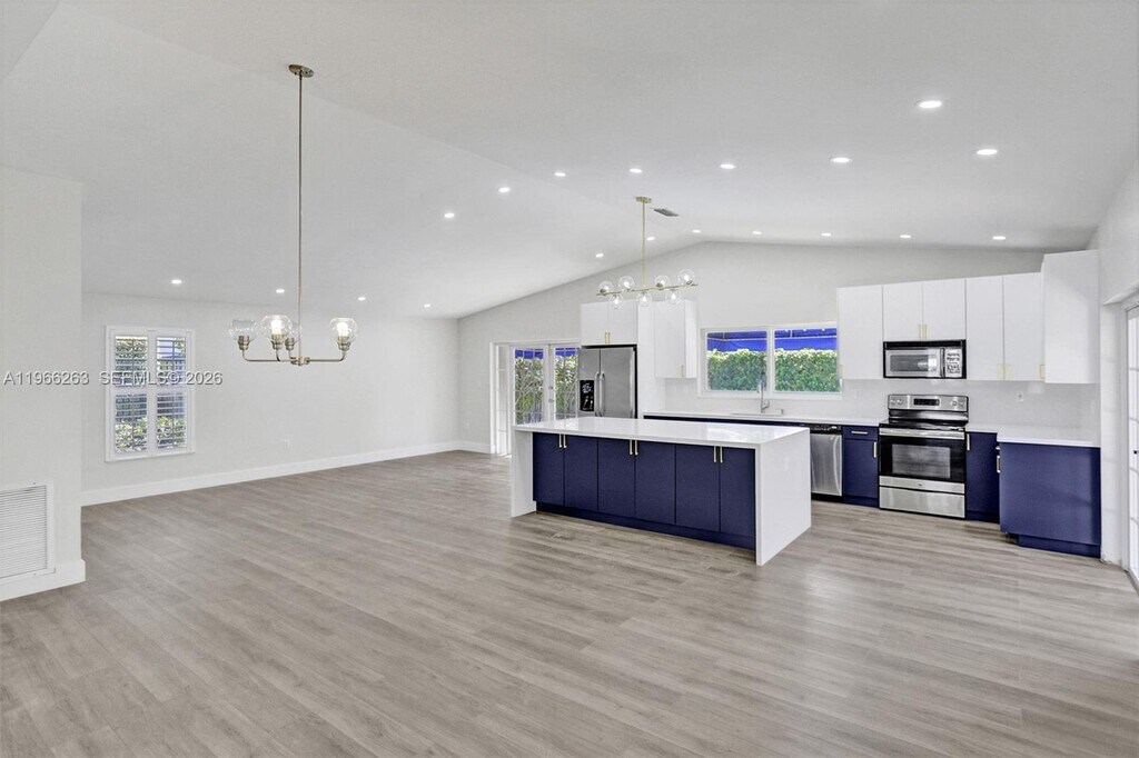 Bright and contemporary, this completely renovated beauty on a no-thru street is defined by its huge rooms, high ceilings, abundant picture windows/glass doors, and a host of eye-catching designer touches. Awash in sunlight enhanced by extensive recessed lighting, the ambiance is fresh and uplifting. The kitchen is a highlight, w/ocean-blue accent cabinets, granite counters, and stainless-steel appliances. The giant open plan kitchen and family room overlook the pool, patio, and large fenced yard w/privacy landscaping. Pool & yard maintenance included. Additional amenities incl. wood-look vinyl flooring throughout w/tiled baths, a 2-car garage, laundry, ceilings fans, and accordion shutters. The quiet setting is near A-rated schools, w/quick access to Kendall Drive, expressways, and US1. MLS # A11966263