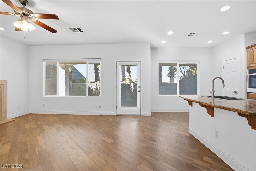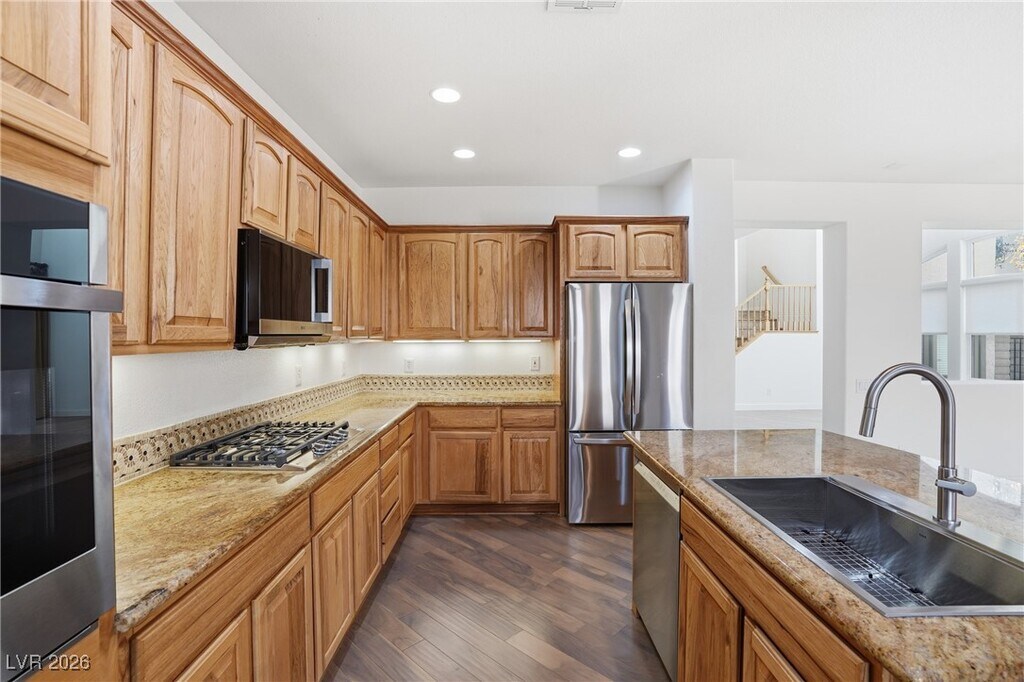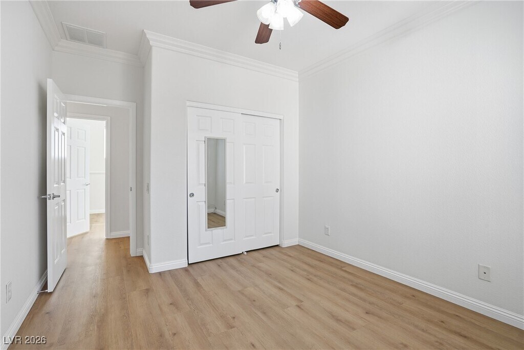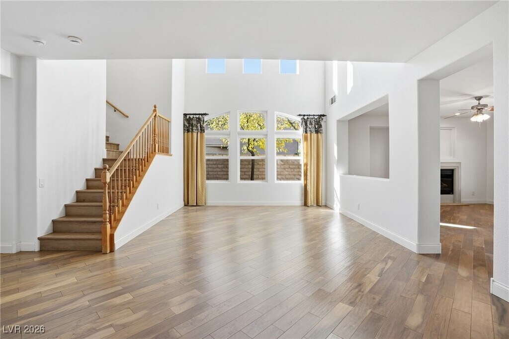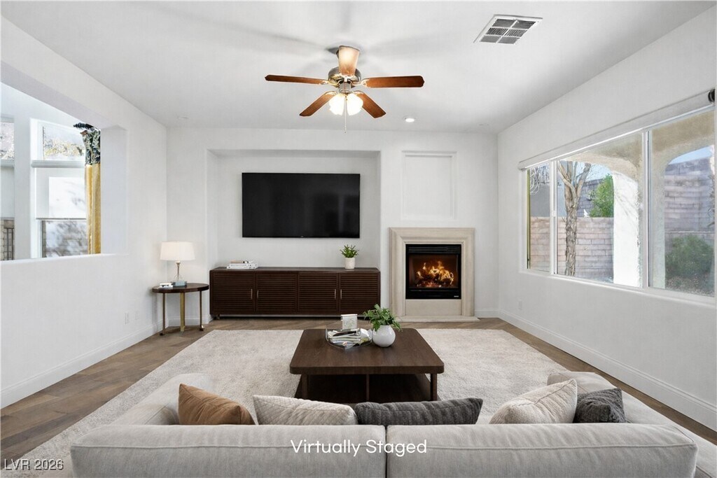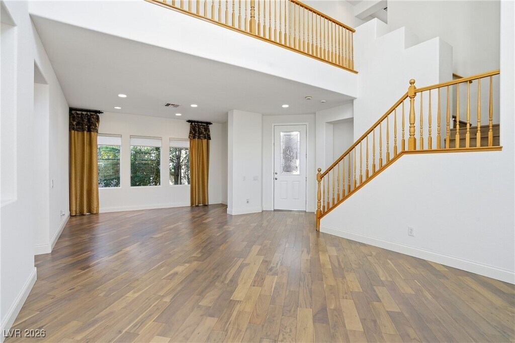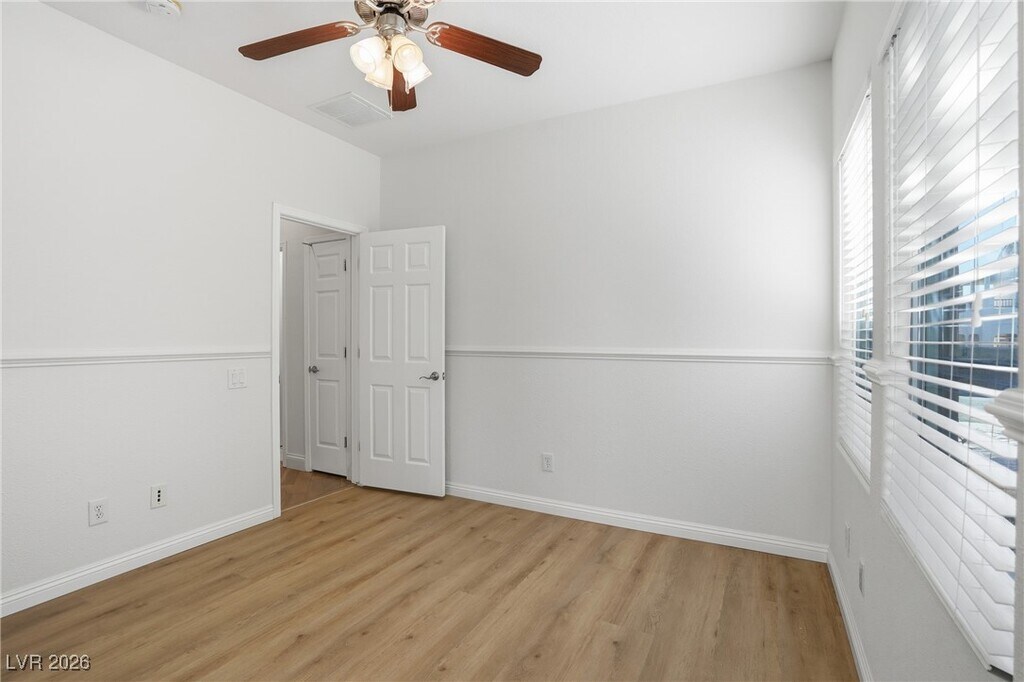 This beautifully updated home has it all: location, schools, upgrades, and community. Situated in the prestigious Paseos neighborhood of West Summerlin, it offers easy freeway access, a nearby park, and proximity to the Summerlin Trail Network, Downtown Summerlin, and Red Rock Canyon. The two-story floor plan features 5 bedrooms and 2.5 bathrooms, including a downstairs bedroom with a private entrance. Upstairs, four additional bedrooms include a spacious primary suite with an attached den plus a private balcony with unobstructed mountain and sunset views. The home has NO CARPET, newly installed luxury vinyl plank flooring throughout, and a fresh interior repaint. Major systems, including AC units, water heater, and water softener, have been recently installed, and the garage includes a 220V outlet for EV charging. The kitchen features brand-new microwave, oven, cooktop, sink, and faucet. This won't last long! (*Minimum credit score of 650 required*)