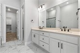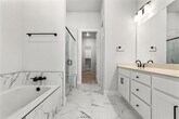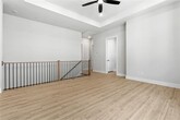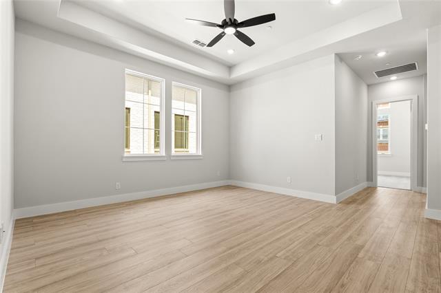 Nearly new townhome situated along the southern edge of the exclusive, gated Newman Village neighborhood. This light-filled end-unit offers 2,642 square feet of well-designed living space, along with a rare side yard and thoughtful separation of living, working, and sleeping areas. The first-floor primary suite provides privacy and everyday convenience, featuring a spacious bath with a separate soaking tub and shower, dual-sink vanity, and a large walk-in closet. The laundry room and powder bath are also located on the main level for added functionality. Upstairs, a central den serves as a flexible second living area, flanked by a vaulted-ceiling bedroom with an ensuite bath and two additional bedrooms sharing a full bath. A dedicated home office or study sits just off the den, ideal for remote work or quiet study. Additional highlights include an end-unit position with extra windows for natural light, an oversized two-car garage with direct access through a mudroom-style entry, and low-maintenance townhome living in an established, well-kept community. Conveniently located near The Star, Legacy West, and Stonebriar Centre, with easy access to the Dallas North Tollway and Sam Rayburn Tollway, this home offers proximity to premier shopping, dining, and entertainment while remaining tucked into a private, gated setting. Zoned to highly regarded Frisco ISD schools.