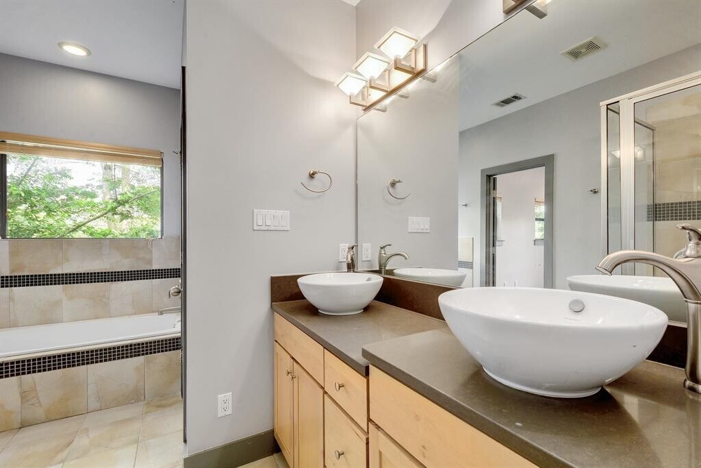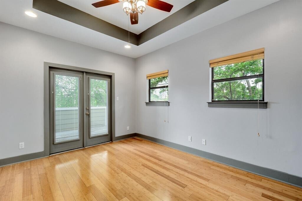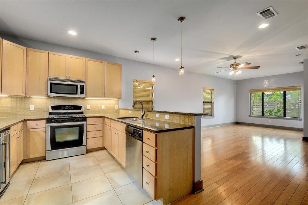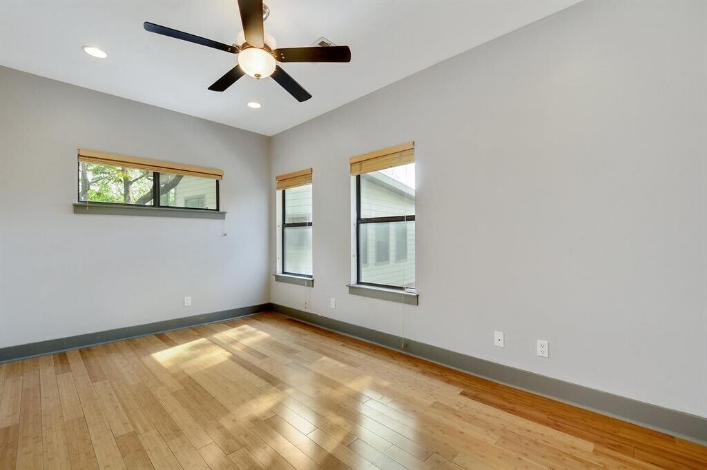 Fantastic East Austin single family home with amazing views of Downtown! High ceilings, open floor plan, lots of great windows and large kitchen. Granite counters, lots of cabinets and counter space, stainless steel appliances including refrigerator and built-in microwave! Downstairs has a large living area with room for dining, kitchen, laundry room, half bath, storage and garage. Upstairs has three spacious bedrooms. Primary bedroom has a private balcony and spa-like bath with downtown views. Bamboo floors and designer blinds throughout with plenty of storage. Attached garage. Private fenced/gated yard with great outdoor spaces in both the front and back yard. SO close to local restaurants, bars, fitness/yoga studios, shops, and public transit. Walkability score: 93!