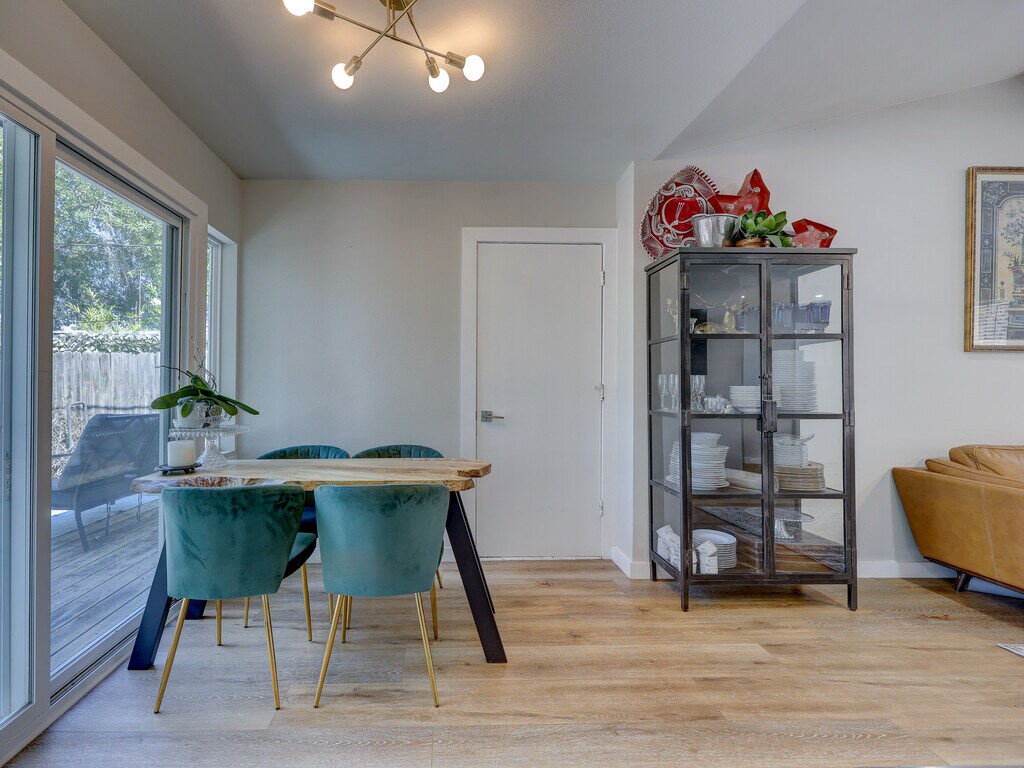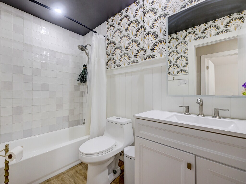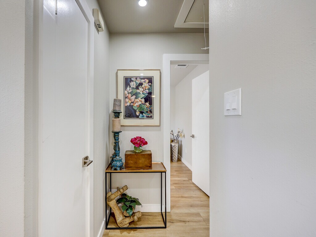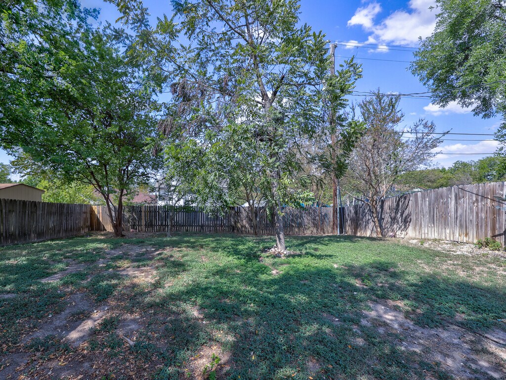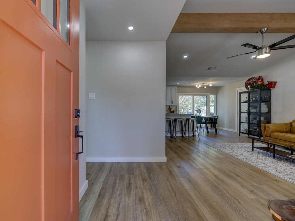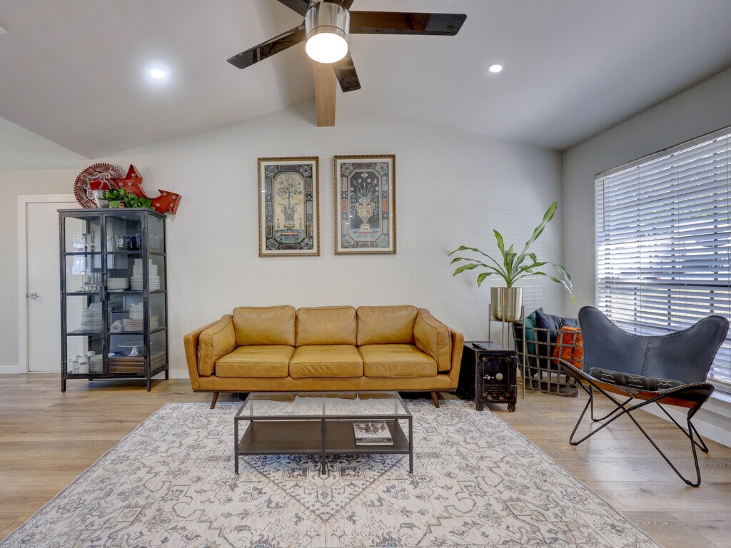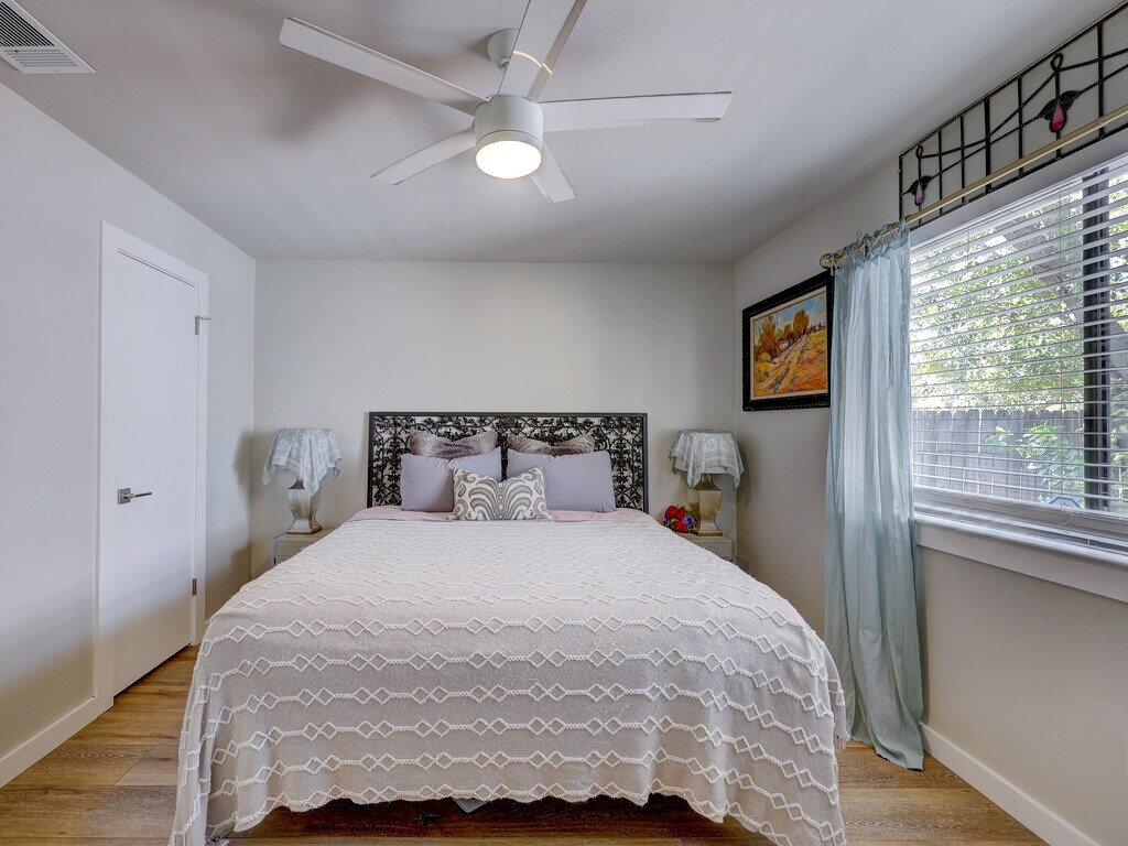 This well-appointed single-story home has 990 square feet of space designed for easy living. Inside are two bedrooms: one with a king-size bed and another with two twin beds. Both rooms have ceiling fans and clothing storage to keep things comfortable and organized. The bathroom includes a tub and shower combination, giving you both options for quick mornings or relaxing evenings. The kitchen is set up with full-size appliances, stocked with the essentials, and includes a kitchen bar with stools for casual meals or quick coffee breaks. The living room provides a sitting area with a smart TV, making it a good spot for relaxing after a long day. A bonus office room is available for those who need a dedicated workspace at home. Practical touches include an in-unit washer and dryer to handle laundry without leaving the house. Outdoors, a back deck offers extra space to unwind or enjoy some fresh air. Parking is straightforward, with options in the driveway as well as on the street. For added convenience, the home has fiber optic internet to keep everything running smoothly, whether you're streaming, working, or gaming. Keyless entry makes coming and going secure and straightforward. With its location just 15 minutes from downtown and close to shops, grocery stores, and transit, this property makes it easy to stay connected to all parts of Austin.