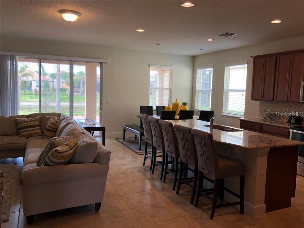 Deluxe single-family home with spectacular lake views; only two miles from Medical City. This 4 bedroom + Office/3 bath home is packed with exceptional features and offers a maintenance-free lifestyle. Internet,cable,landscaping,gym and recreational areas are all included in the rent. Inside of this beautiful community is a gas station,mini supermarket,deli,pizza parlor facing the pool,a party and conference room,library,hair salon,and a pet grooming and spa. This home features ceramic tile throughout with carpet in the bedrooms,4 spacious bedrooms including a master bedroom with generously-sized closets by design. The kitchen includes stainless steel appliances with granite countertops spectacular backsplash and wall design in the open living room area. The Village Walk Community of Lake Nona is a 24-hour guarded and gated community complete with a town center,fitness center,two community pools,tennis courts,paved biking and walking trails that meander around lovely lakes and bridges. Must see to appreciate.