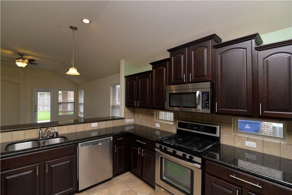 Fabulous four bedroom home! Versatile open floor plan. Chef's kitchen with granite counters and gas stove. Master suite boasts his & her vanities, walk-in closet, separate shower with body jets and garden tub. Backyard includes covered patio with gas stub for a grill. Over-sized garage and sprinkler system. Walk to pool and park! Conveniently located to schools and major thoroughfares! Don't miss this one! No smoking inside property. Rental ins. required. Call to view today!