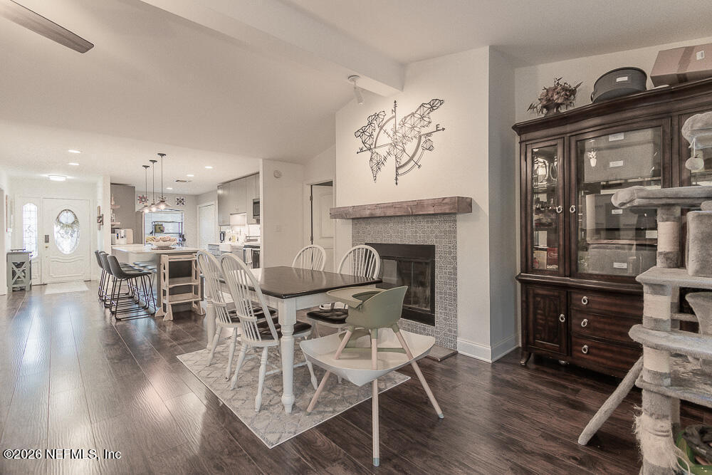 Stunning brick front home boasts 4 spacious bedrooms and features: a foyer entry,a formal dining room,fully remodeled eat-in kitchen with all SS appliances,new cabinetry,quartz counters; a spacious great room showcasing vaulted ceilings,mantled wood-burning fireplace,and built-in bookcase; French doors lead to a screened porch & private,fenced backyard. Neutral and bright colors. Master bath remodeled with two vanities and walk-in shower. Home is perfect for entertaining! Side and rear exterior cementitious siding. Updates include: New LVP flooring,Newer HVAC (2014),50-year shingle roof & gutters (2011),New electric hot water heater (2017). Functional Greenhouse. Includes Tesla charger in garage. Lawn care included. MLS# 2125663