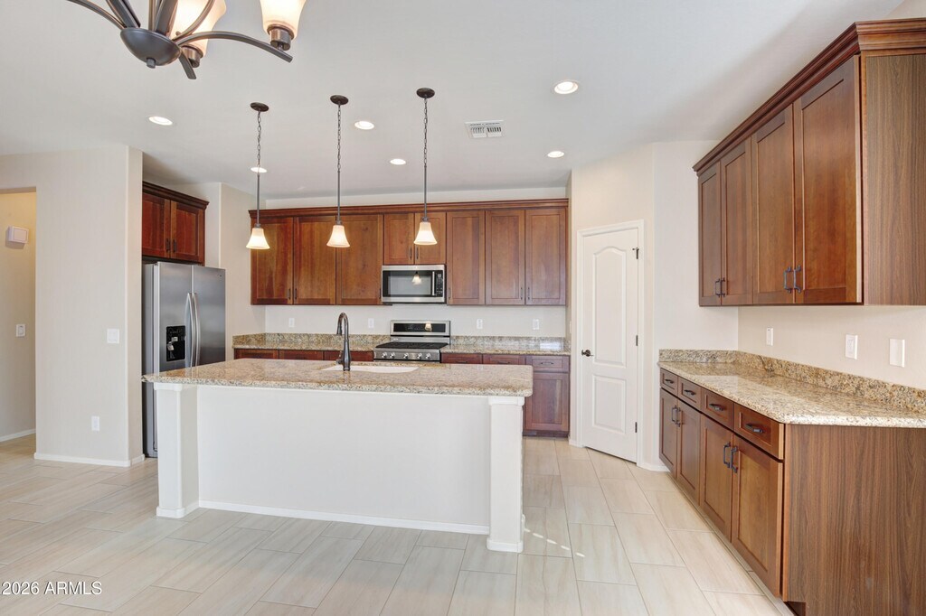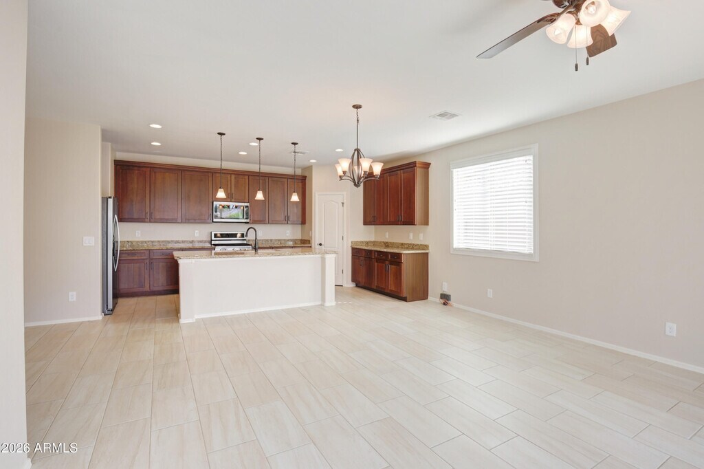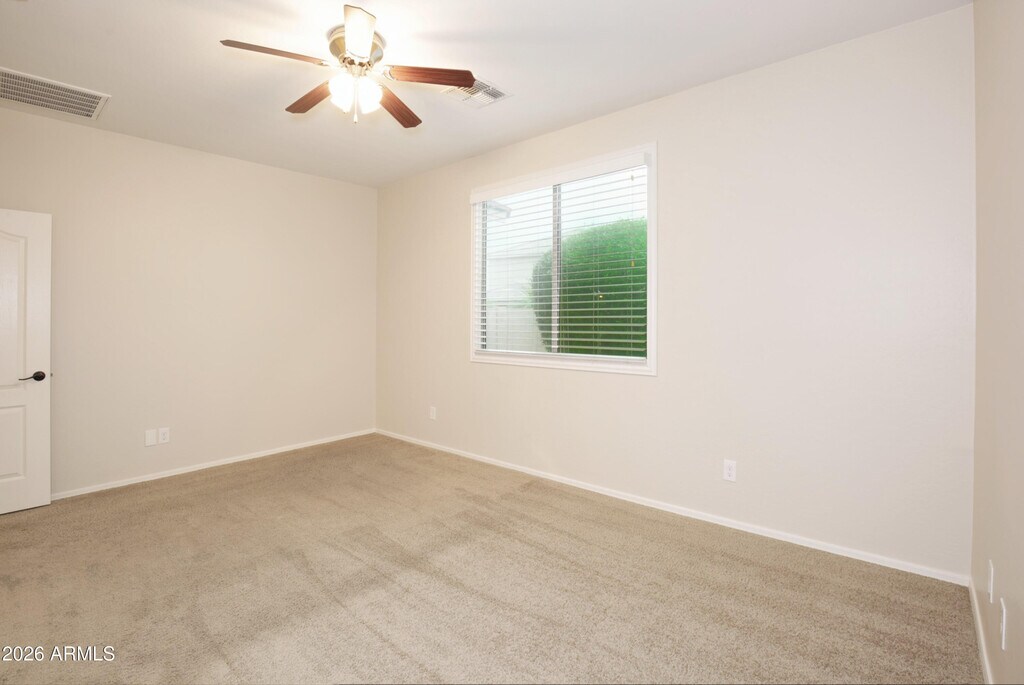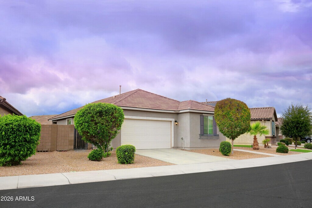 Charming 3BR/2BA home in sought-after Coldwater Ranch! Granite counters,kitchen island,stainless steel appliances & split bedroom floor plan make this a wonderful place to feel at home. Spacious living room flows seamlessly to the covered patio through a full wall-length sliding glass door. MBR features a large closet,dual vanities & a private toilet room. 2 Guest bedrooms share a dedicated full bathroom. Tile living,carpeted bedrooms. 9ft+ ceilings throughout. 2-car garage. Fenced backyard w/artificial grass & stone. Rent includes trash service + basic landscaping. Washer/dryer and refrigerator included. PUSD - Lake Pleasant Elementary & Liberty High School. Close to Vistancia Marketplace,Vistancia Point,and the ''4-Corners.'' Easy access to the 303 and Happy Valley Rd. Owner/Agent.