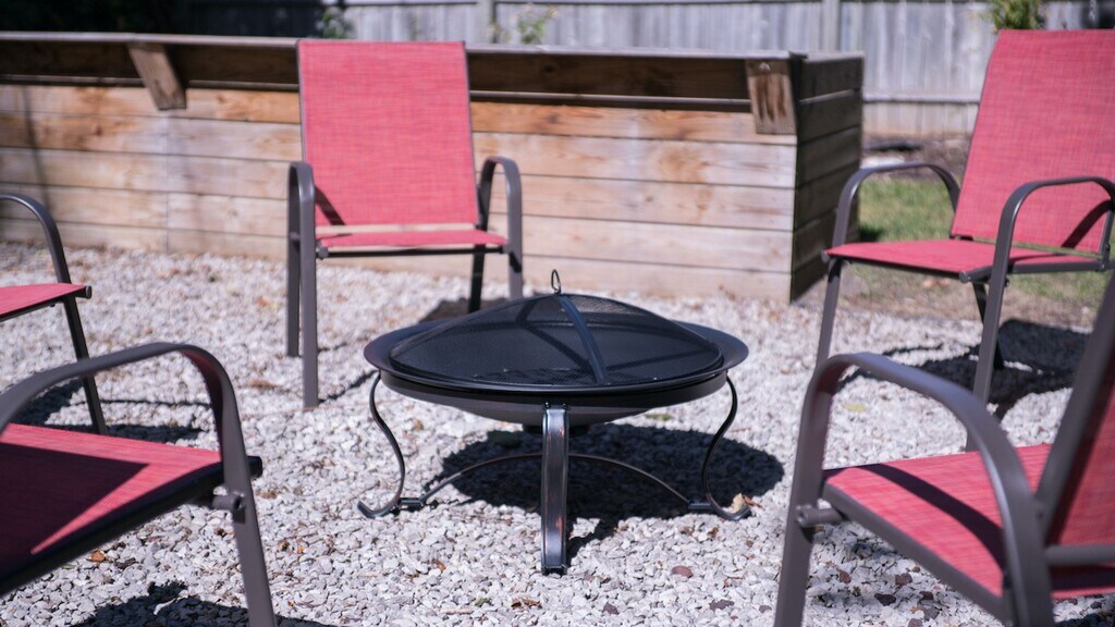 This is a small ranch house with a simple and open layout. The square footage is in all the areas you will want it, the kitchen and living room. With queen beds and side tables on each side in all three rooms, you will still have plenty of space to move around and access your closets. Centered to all three rooms is the bathroom where you will find the shower equipped with body wash, shampoo, and conditioner. You will have plenty of space to hang your clothes and towels while still being able to use the more than adequate counter space. Outside in the backyard, you will find a quiet, secluded space equipped with a firepit and six outdoor chairs near the large wood planter. This is a great place to sit back and relax while you hang out with your own thoughts or make some great memories with your friends.