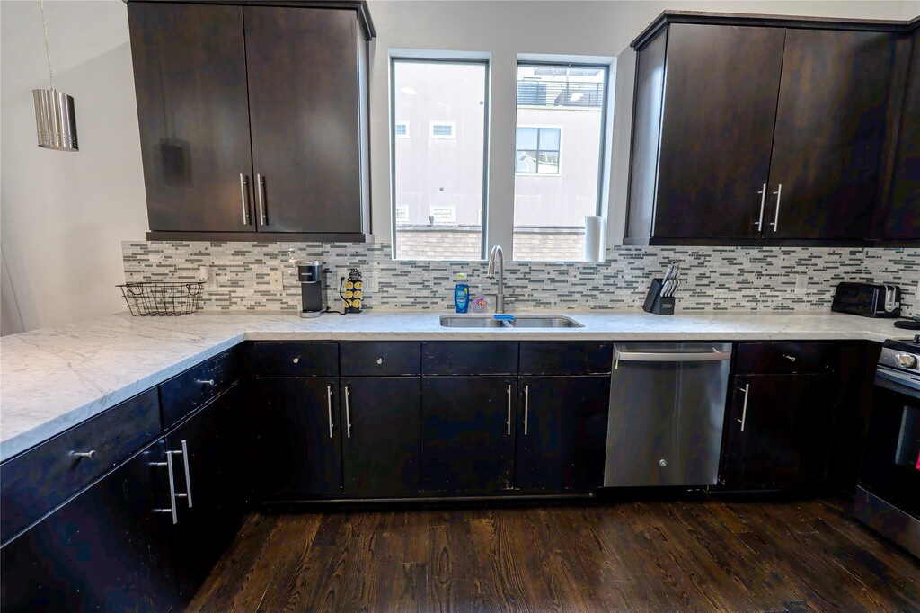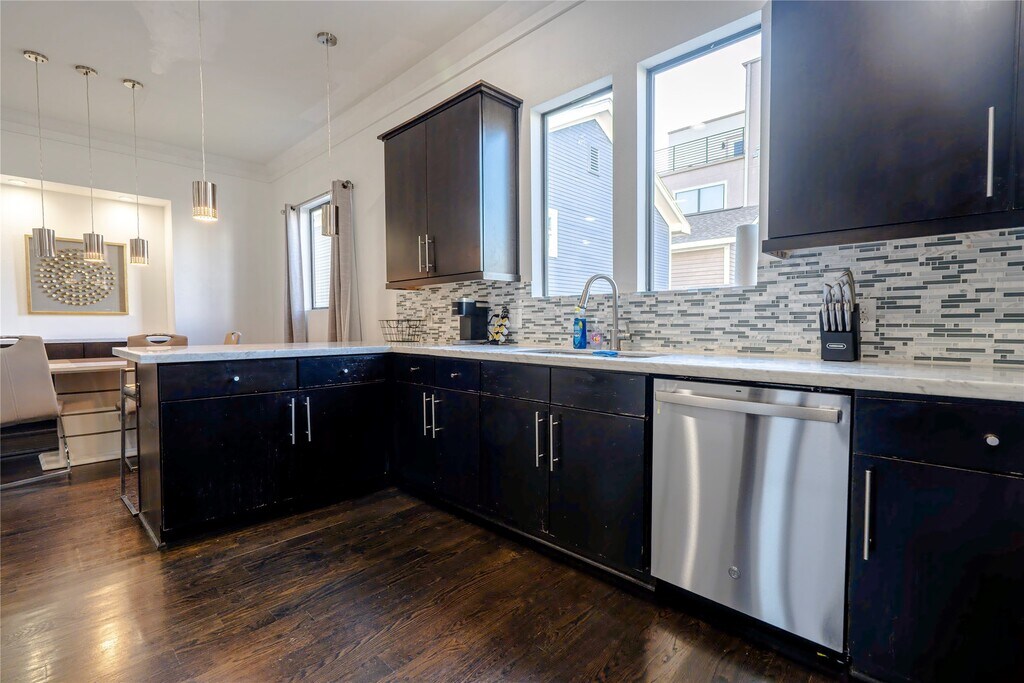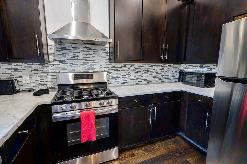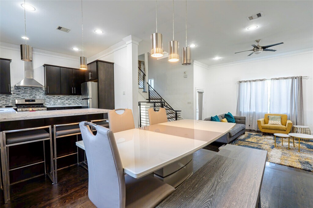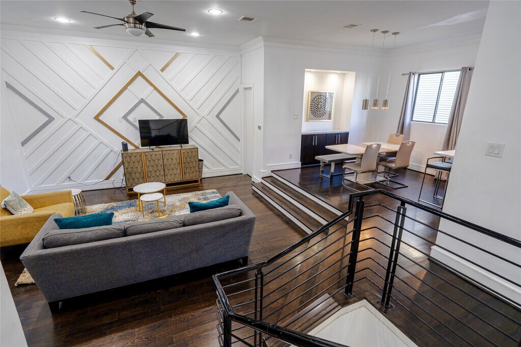 Contemporary townhome in the First Ward Arts District with easy access to Sawyer Heights favorites—Farmers Market,art studios,dining,and top-rated Crockett Elementary. This 4-story home offers downtown views and quick entry to the White Oak Hike & Bike Trail and nearby parks like Eleanor Tinsley. All bedrooms are en-suite with modern finishes,high ceilings,and an open second-floor layout. The first-floor bedroom,currently an in-law suite,is flexible for an office,gym,or hobby room. Home is in a no-horn train zone. Recent updates include a Hydrostopp roof system,interior painting,new primary French doors,trim,and carpet,and a gas range. Property is sold as-is. All documents and estimates are provided,and pricing reflects needed repairs. MLS# 52462403