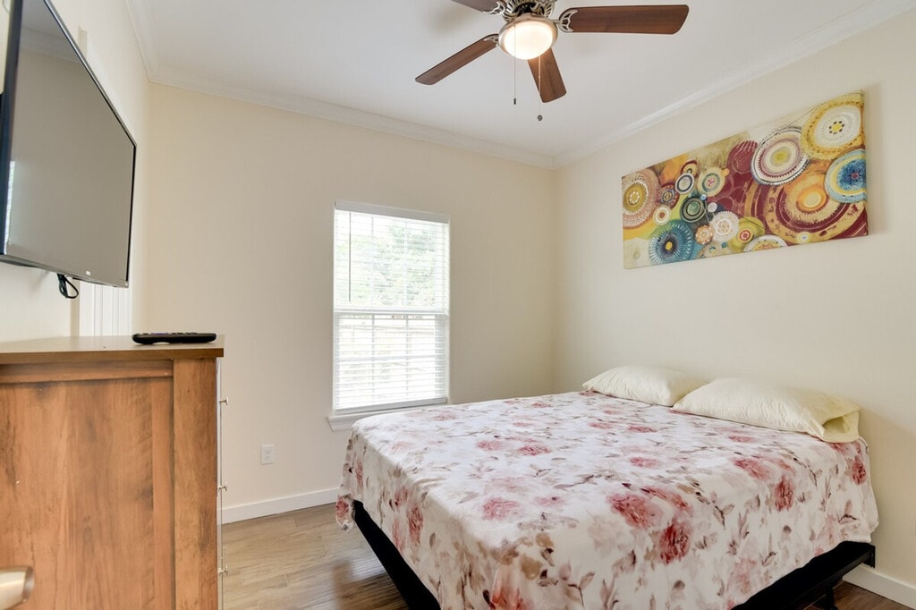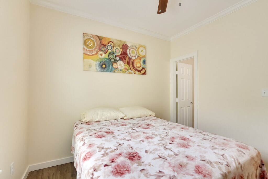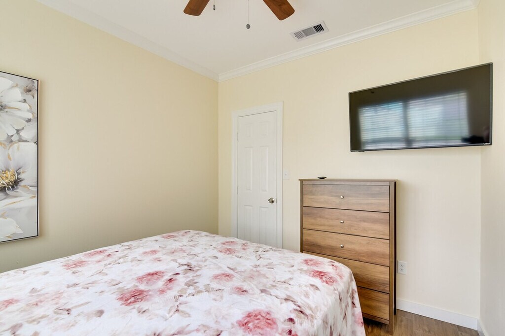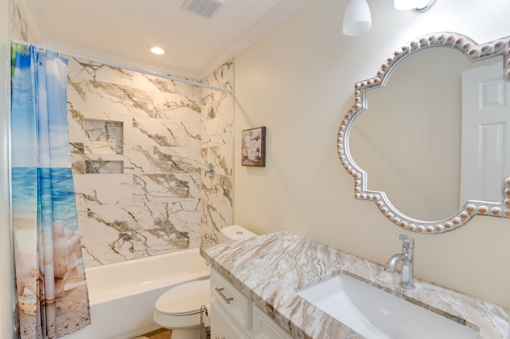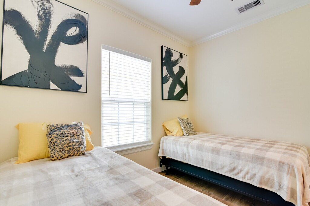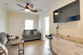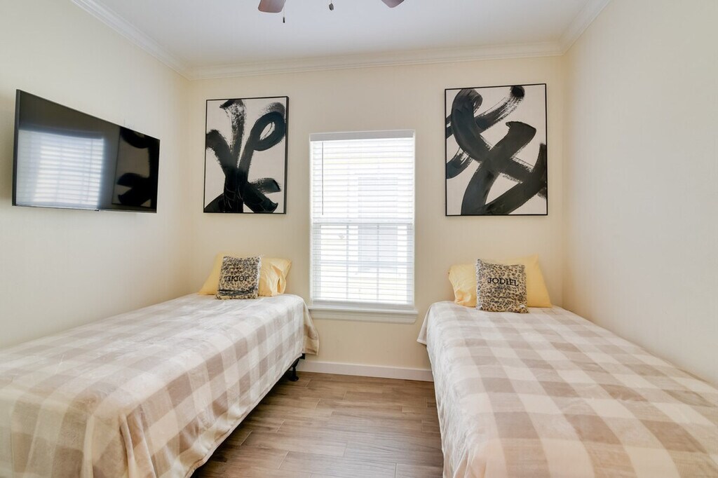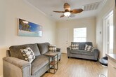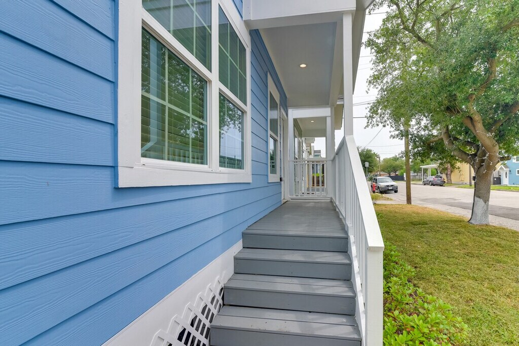 Feel at home in this Galveston vacation rental, a single-story home requiring five steps to access. It is situated less than a mile from the Galveston Island Historic Pleasure Pier. This retreat is equipped with free Wi-Fi, in-unit laundry, and a full kitchen with stainless steel appliances, cooking basics, dishware, flatware, a dishwasher, stove, oven, refrigerator, microwave, and drip coffee maker. For entertainment, enjoy the Smart TVs and tic-tac-toe. Soak up the sun at Galveston Beach, enjoy a fun-filled day at Moody Gardens, or explore nearby historic attractions. Quiet hours are observed from 10:00 PM to 7:00 AM. The property features two exterior security cameras located on the back of the home facing the air conditioner and on the front of the house facing the entrance. The cameras are outward facing and do not look into interior spaces. The cameras record video and sound when activated by motion. No pets, events, parties, or large gatherings are allowed. [SI]