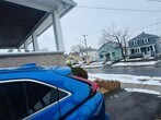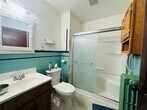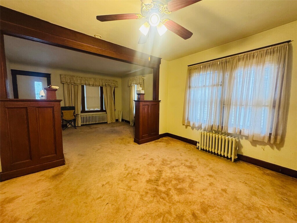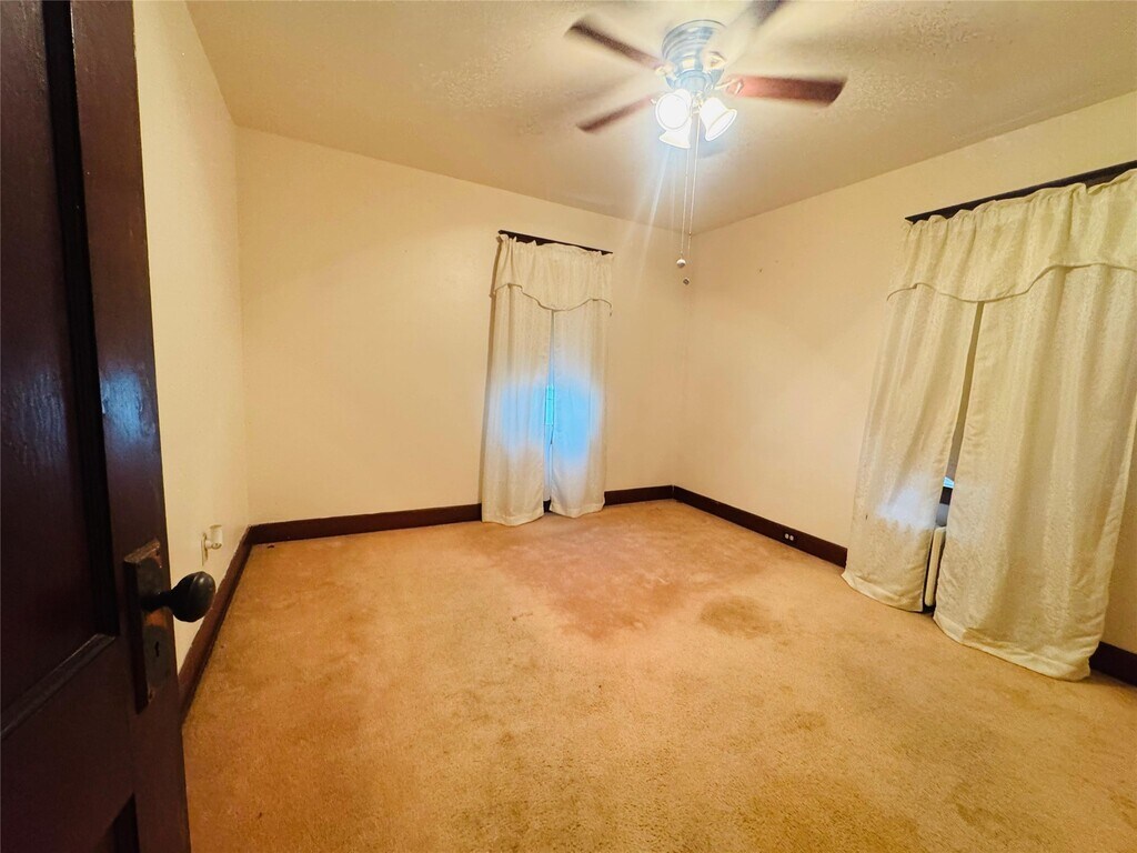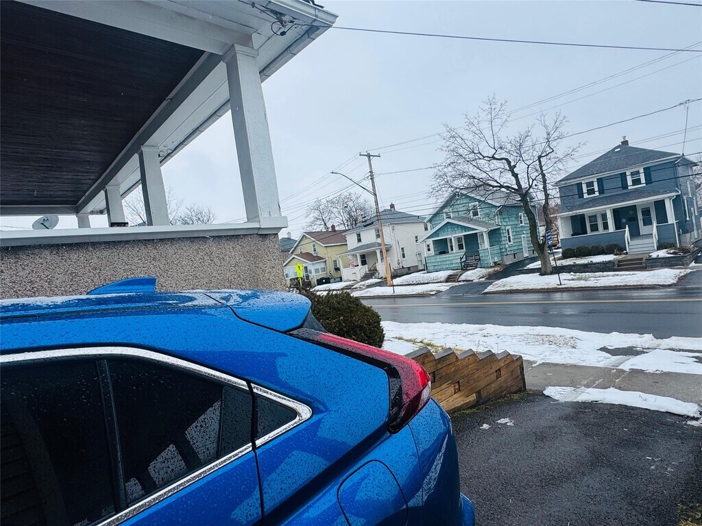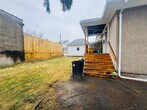The house features a large front porch that leads into an open living room and dining room area. The kitchen is conveniently located on the other side of the stairs. On the first floor,there are two decent-sized bedrooms,both equipped with large walk-in closets,with a full bathroom situated between the two rooms. Outside,the driveway can accommodate 2–4 cars depending on their size. There is also a small yard in the back featuring a small deck overlooking the space..
