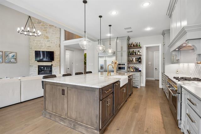 This stunning custom built home that blends refined design with functionality in one of Dallas’ most desirable ares. Thoughtfully designed with most living spaces on the main level, this home offers an ideal layout for both everyday living and elevated entertaining. Inside, wide-plank wood floors, solid core doors, crown molding, and designer lighting set a sophisticated tone throughout. The private study features elegant wainscoting, stained cedar beams, and a striking chandelier, while the main living area is anchored by a dramatic floor-to-ceiling stone fireplace with cedar beam accents and seamless access to the outdoor living space. The chef’s kitchen is both beautiful and highly functional, showcasing custom cabinetry, quartz and quartzite countertops, a marble backsplash, and an oversized alder island. Premium appliances include a 48-inch JennAir dual fuel range, built-in KitchenAid refrigerator, warming drawer, microwave, and custom vent hood, all complemented by a large walk-in pantry and under-cabinet lighting. The main level includes the primary suite, a secondary bedroom, a media room, and a sunroom, while a spacious game room is located upstairs. The primary suite is a true retreat with cedar beam, a spa-inspired bath featuring dual vanities, a freestanding tub, and an expansive walk-in shower with dual rain head. Outdoor living is exceptional, with two rear covered porches and a fully equipped kitchen complete with honed granite countertops, EVO griddle, Memphis smoker, and ample storage. The oversized backyard offers plenty of room for a future pool and is enclosed by an 8-foot board-on-board cedar fence for added privacy. Additional highlights include dual laundry rooms, a full security system, atoms speakers in the media, tankless water heaters, plantation shutters, and an oversized three-car garage with epoxy flooring. This is a rare opportunity to own a thoughtfully designed, move-in ready home with luxury finishes and an unbeatable layout.