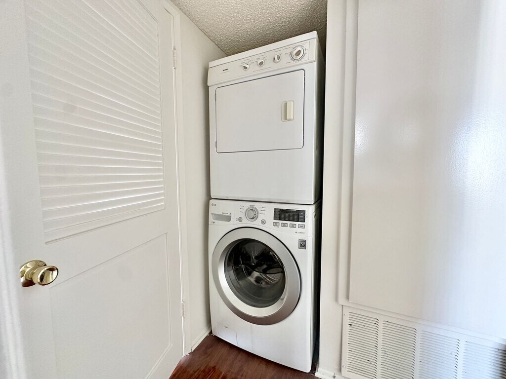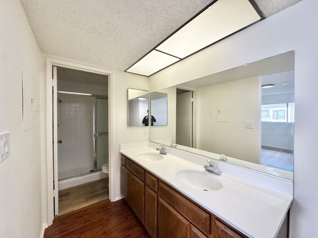Enjoy the ultimate privacy with no shared walls in this top floor unit! This spacious apartment has two bedrooms, 2 bathrooms, hardwood style floors, in unit washer/dryer, and two parking spaces. Enter into the spacious living room with lots of natural light, a gas fireplace, and a wet bar. Adjacent is the dining area, and kitchen. The kitchen has plenty of counter space / cabinet space, a gas stove and oven, and a microwave. The primary bedroom has large closets and an en-suite bathroom. The secondary bedroom is spacious and bright with closet space and access to the secondary bathroom. Live in comfort with central A/C and heat, an in unit washer/dryer, and two assigned parking spaces. Water and trash are included. No pets allowed.