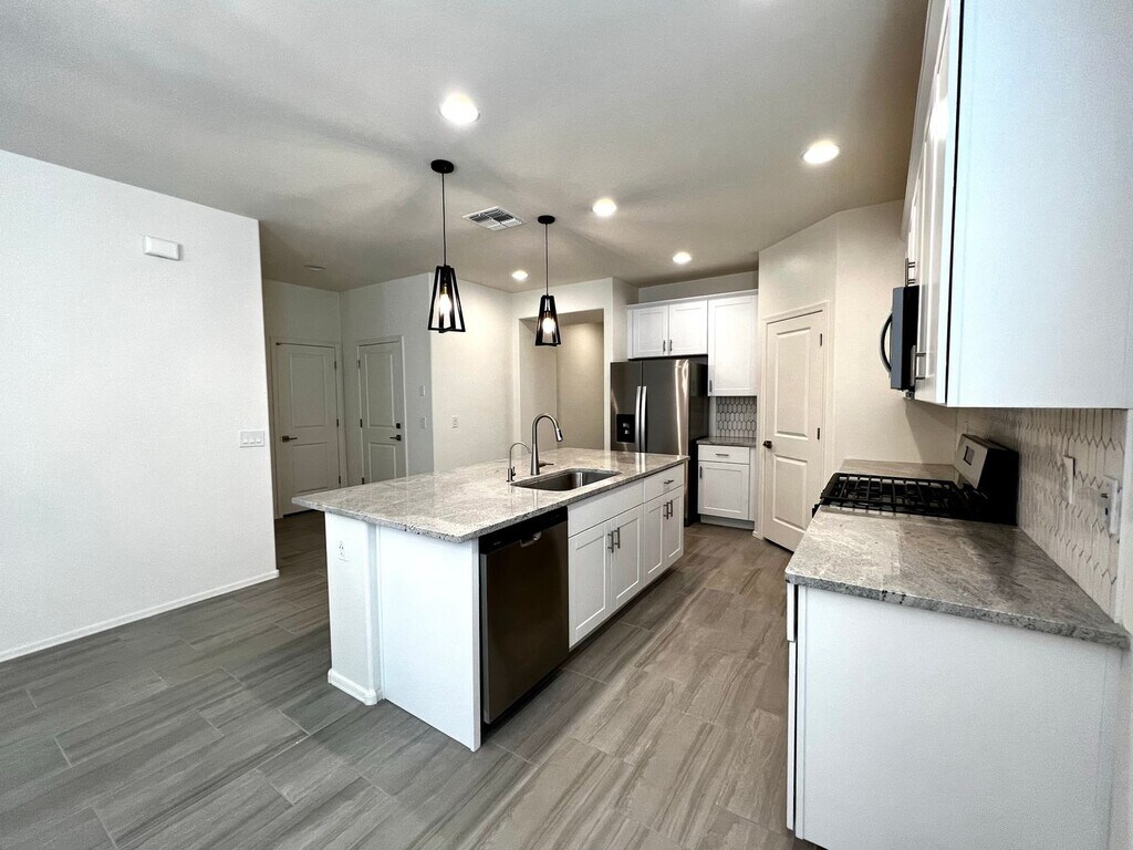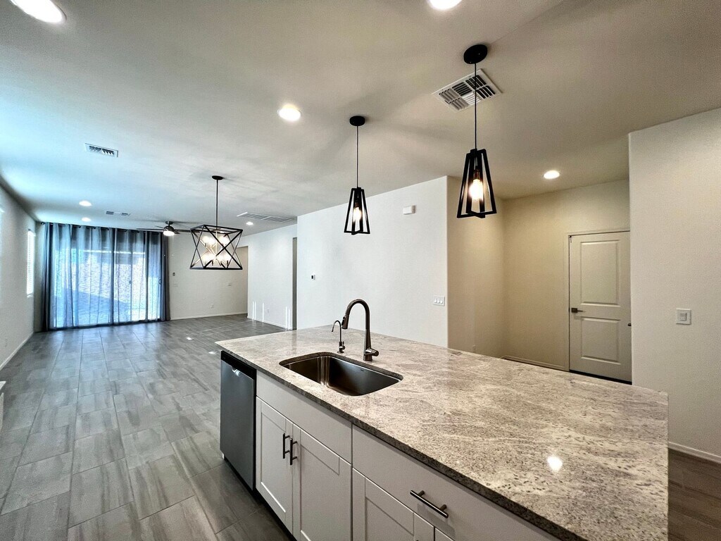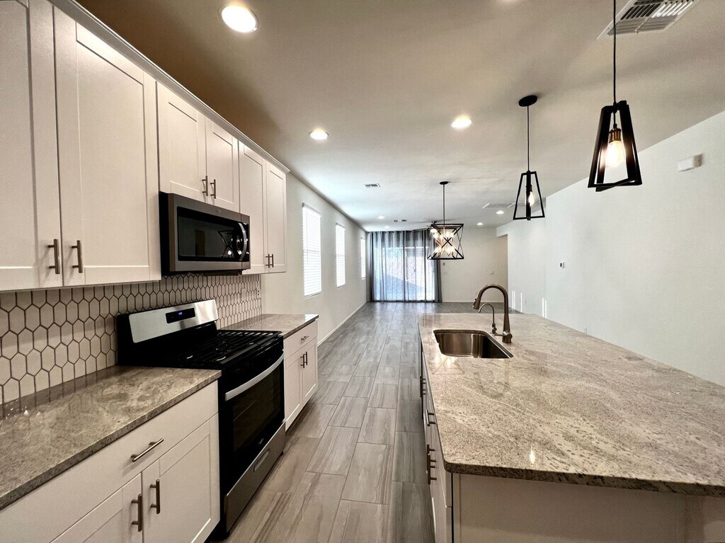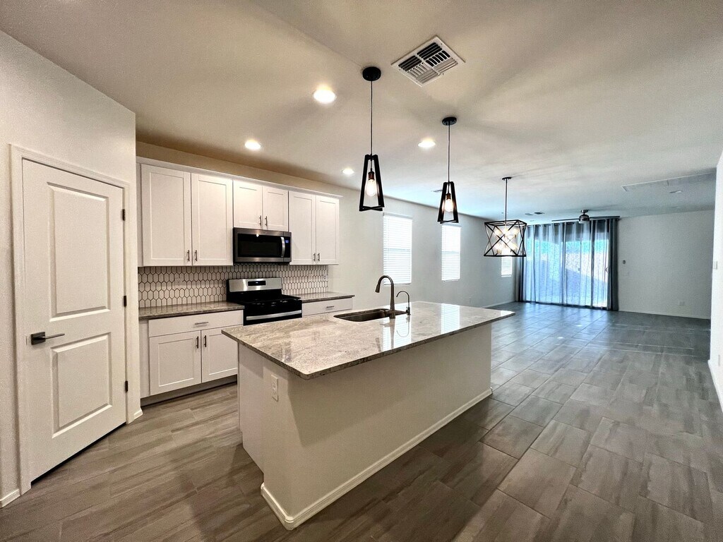 The great room features lots of windows for natural light and mountain views. Beautiful kitchen with white cabinets, stone countertops, Island bar, pantry and stainless appliances refrigerator, dishwasher, and gas range. Guest bedroom with the en suite bathroom. Two other guest bedrooms with a secondary living area. Large laundry room with built-in cabinets, utility sink and washer and dryer. Ceiling fans and plank tile flooring throughout and carpet in the bedrooms. Nice master suit and en suite with dual sink vanity, walk -in shower and large walk-in closet. Water Softener, RO System, Washer and Dryer included. Mountain views and lot adjoins common area to the west. Covered rear patio and extended paver brick patio. Convenient access to employment centers and downtown Tucson. Amenities include splash pad, community garden, dog park and greenbelts. Good credit, background and income required. All pets must be preapproved with extra security deposit. Please call to see this home.