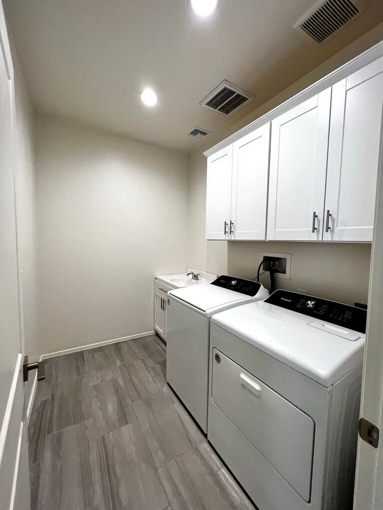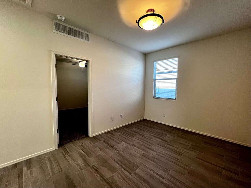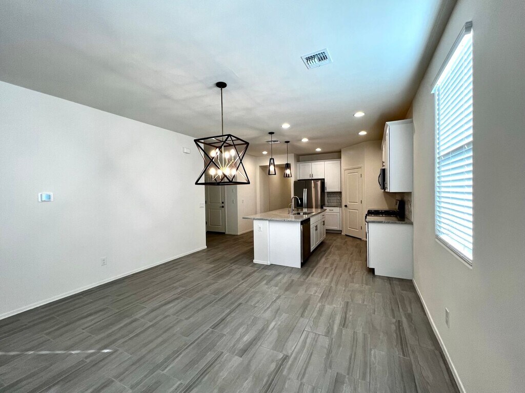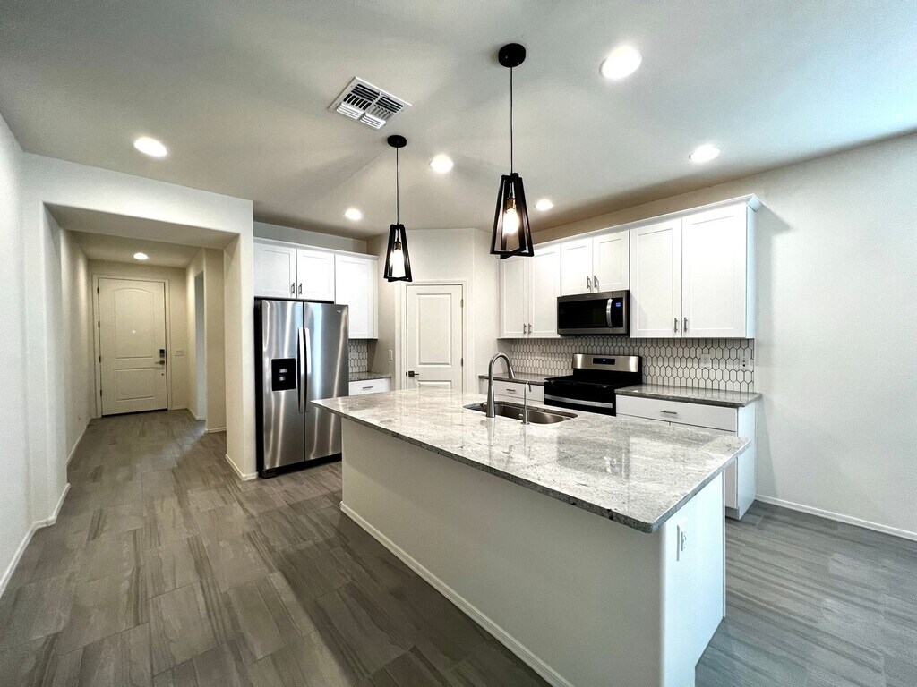 The great room features lots of windows for natural light and mountain views. Beautiful kitchen with white cabinets, stone countertops, Island bar, pantry and stainless appliances refrigerator, dishwasher, and gas range. Guest bedroom with the en suite bathroom. Two other guest bedrooms with a secondary living area. Large laundry room with built-in cabinets, utility sink and washer and dryer. Ceiling fans and plank tile flooring throughout and carpet in the bedrooms. Nice master suit and en suite with dual sink vanity, walk -in shower and large walk-in closet. Water Softener, RO System, Washer and Dryer included. Mountain views and lot adjoins common area to the west. Covered rear patio and extended paver brick patio. Convenient access to employment centers and downtown Tucson. Amenities include splash pad, community garden, dog park and greenbelts. Good credit, background and income required. All pets must be preapproved with extra security deposit. Please call to see this home.