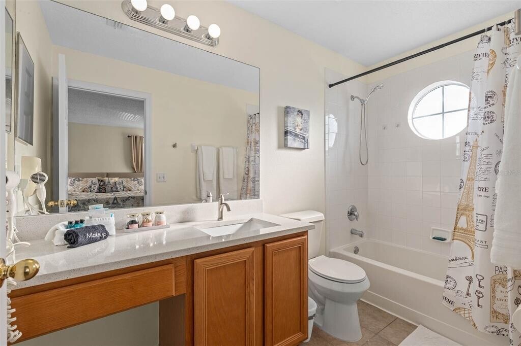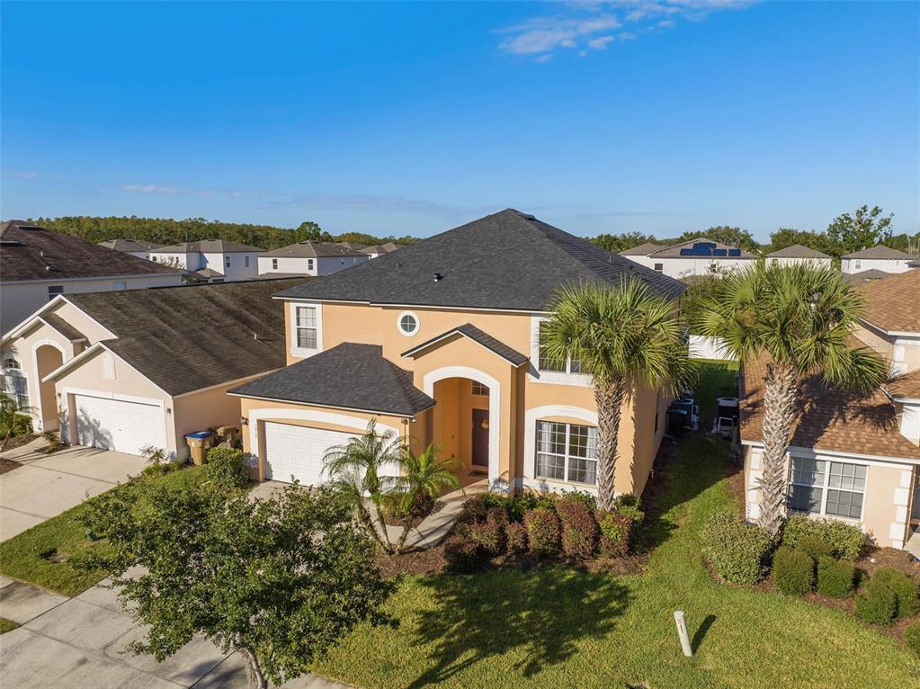 Some photos are STAGED. Schedule your showing for this amazing spacious 6 bedroom,5.5 bath,with Heated POOL and additional den/office The sparkling POOL has a large deck and covered lanai and is fully screened. Wonderful open concept with high ceilings. Kitchen features: sleek stainless steel appliances including farmhouse sink and french door refrigerator with drink door,granite counter tops,pantry and Huge island with space for counter chairs. Bright large dining area for family dinners and grande open concept living and kitchen area,sliding doors leading to the covered lanai and screened heated pool,perfect for relaxing and fun. 4 out of 6 generously sized bedrooms are master suites featuring: Tub with shower and granite vanity. Primary Master suite features: Garden tub,separate shower and granite vanity. Upstairs has brand new Vinyl flooring throughout,NO carpet. Garage with new epoxy floor,offers 2 car parking,Perfectly located minutes from shopping,restaurants,entertaining and theme parks MLS# S5119993