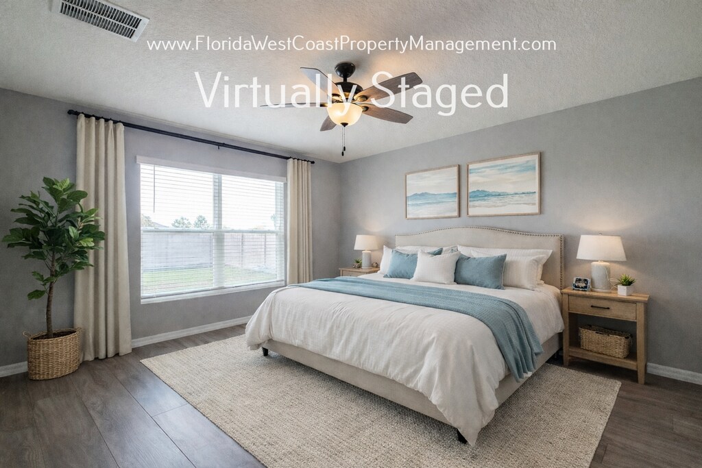 WELCOME to this 2021-built DRH home in Bella Lago Parrish: an outstanding 3-bedroom, 2-bath residence with a 2-car garage on a corner lot PLUS LARGE FENCED YARD! The ARIA floorplan is all concrete block construction with a make sense layout optimizing your living space. The home features tile flooring throughout with stunning LVP flooring in all bedrooms! NO CARPET! The kitchen is well equipped with granite counters, stainless steel appliances, kitchen pantry plus an additional bakers rack to ease all your cooking needs! The kitchen island is a perfect place to add several bar stools and makes food prep a breeze! You will appreciate direct access from the kitchen to the large dining space, to the well-appointed living room and easily move to the fully screened patio! Imagine those stunning Florida Sunsets from the screened patio! Bedrooms, one and two are situated towards the front of the home and offer ceiling fans, standard closets and share the full hall bath. The washer and dryer are situated in their own laundry room located near the front bedrooms and garage access. The primary suite has a clean layout with dual windows allowing lots of light ,ceiling fan, large closet and en suite with dual sinks and shower inset. BELLA LAGO in Parrish boasts community amenities that include, large community pool, fitness room, sport field, picnic area, tot-lot/playground. The location places you only minutes to food shopping, North river shopping, North River Community Park, Moccasin Wallow and 301! You are only 5 miles to I75, 25 miles to St. Pete, and convenient distance to Anna Maria Island, and Sarasota! Visit the website for all details. *** WE DO NOT MARKET ON CRAIGSLIST! WE DO NOT MARKET ON FACEBOOK MARKET PLACE! *** *Lawn mowing Included *3 domestic pets with a minimum age of 2 years. Breed restrictions apply for homeowner/insurance purposes. This applies to pets only. * An Additional pet deposit of $300 per pet is due at lease start. The tenant is required to have renter's insurance that includes the pet. A one-time pet application fee of $150 per pet is due at lease start. NO PET RENT! * Annual/ Long term lease. *75 app fee per all adults 18+A larger deposit could be required depending on application result *One time move in make ready move -In fee of $250 due at lease start * In order to schedule a showing you will be asked to provide a copy of photo ID of each person (18 and over) that will be touring with you. *Pest Control included/owner provided HVAC filters. *EV friendly *Tenant responsible for utilities. Tenants shall also have renters insurance. *Move in funds are paid in certified funds/ APPLICATION FEES NON REFUNDABLE**** *If an application is submitted, and it has missing information , this can delay the process. Please fully complete applications *A home is only held off the open market with a fully completed and approved application and deposit.