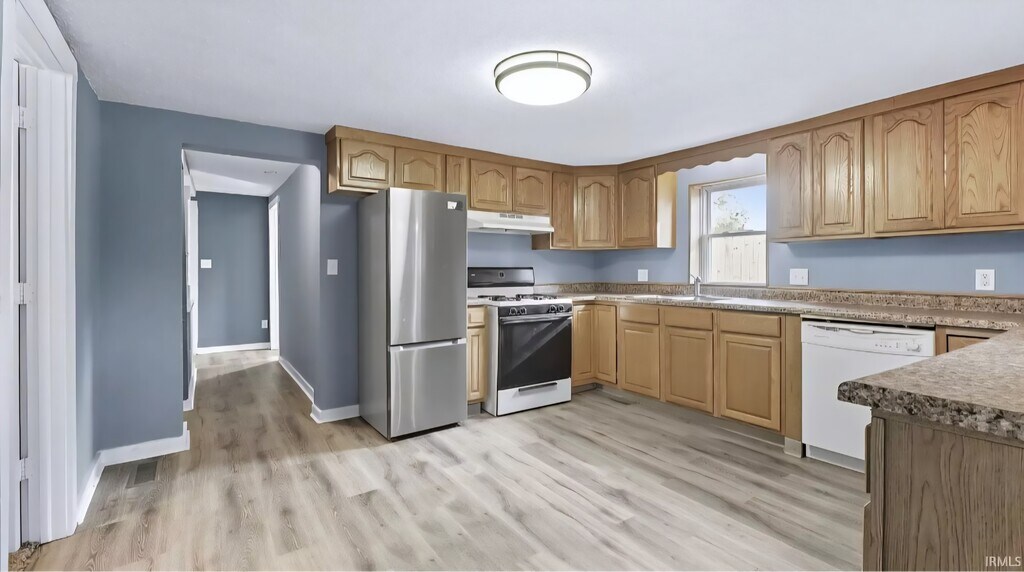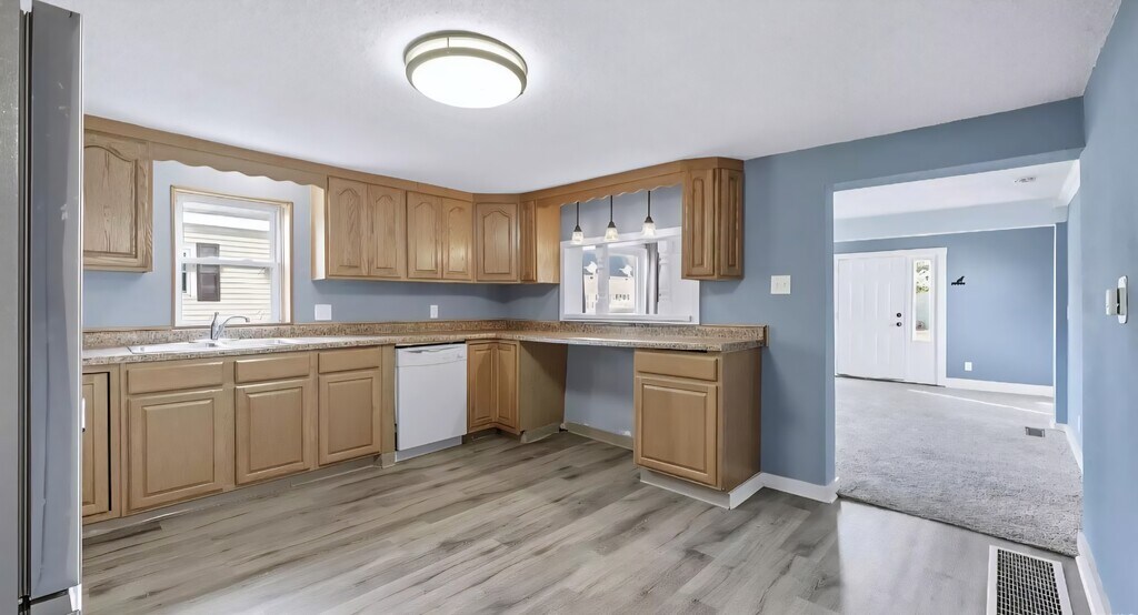 Discover the potential in this 3-bedroom, 1-bath ranch set on a rare double lot in New Haven. This home features an eat-in kitchen complete with a gas range, hood, fridge, dishwasher - all included. The partially finished basement houses laundry and provides space for storage or future expansion. The main level offers a practical layout with a mix of flooring, Step outside to enjoy a fenced-in backyard, open patio, and a front deck, giving plenty of options for outdoor living. With its generous yard, established neighborhood setting, and solid structure, this home is ready for your finishing touches.