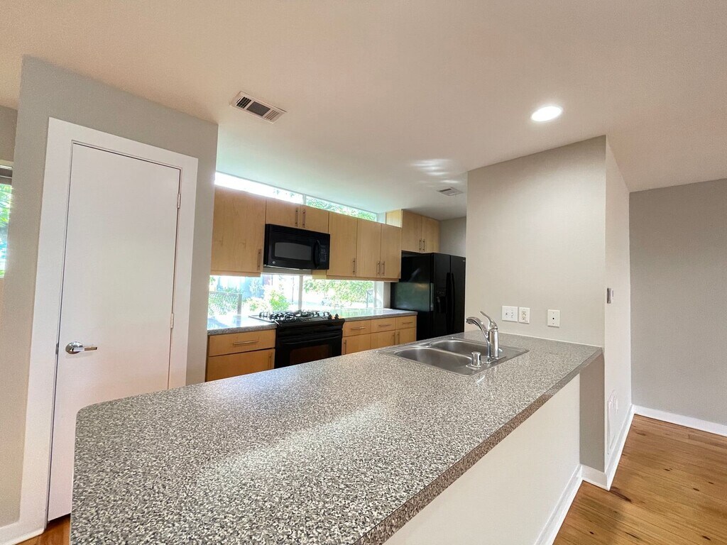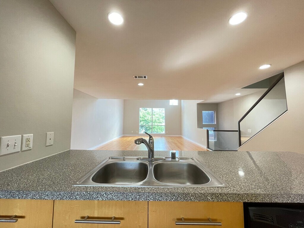 Stylish, multi-level luxury loft near downtown Dallas showcasing an open-concept living and kitchen space with pine hardwood floors, a gas cook top, soaring ceilings, and walls of windows that flood the home with natural light. The main entry level offers two bedrooms, a full bath, a laundry area, and access to a private, turfed patio—perfect for entertaining or relaxing. The top floor is a serene primary suite featuring a nook ideal for a home office or private retreat. Gated property with an attached two-car garage. This home is walking distance to the Akard Lightrail station.