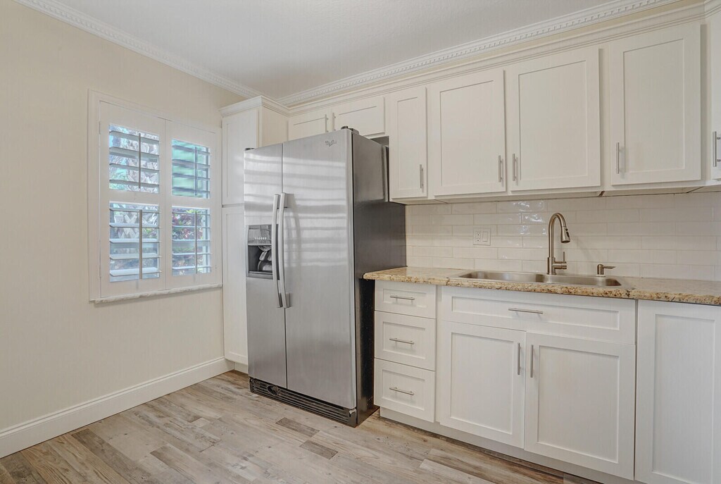 Welcome to 122 Lake Rebecca Drive in Golden Lakes Village! This beautifully renovated 2-bed, 2-bath bright corner villa features luxury vinyl flooring, a modern kitchen with stainless steel appliances, plantation shutters, and updated baths. Enjoy peaceful lake views from the spacious Florida room. Accordion shutters throughout for storm protection. Just steps from the pool in a gated 55+ community with great amenities. Move-in ready and full of charm!