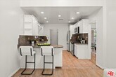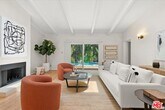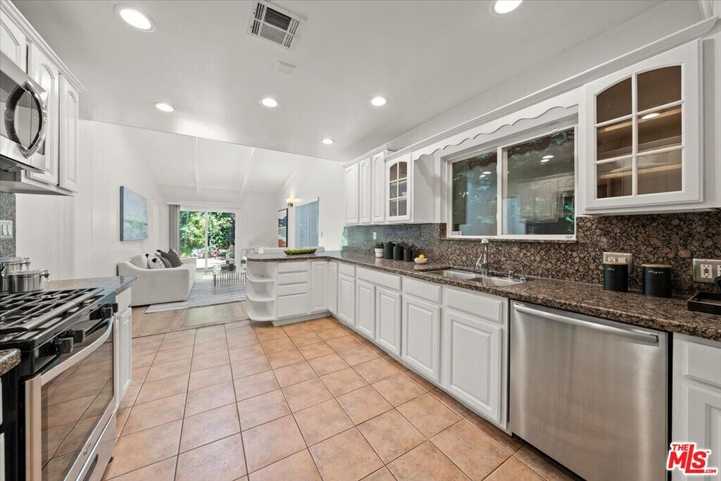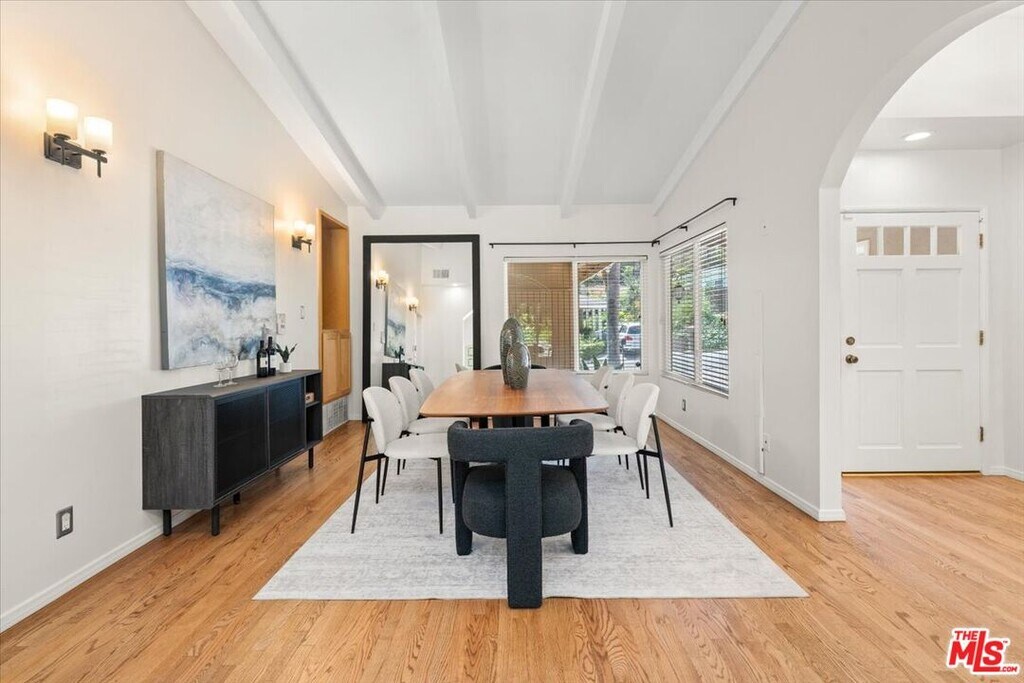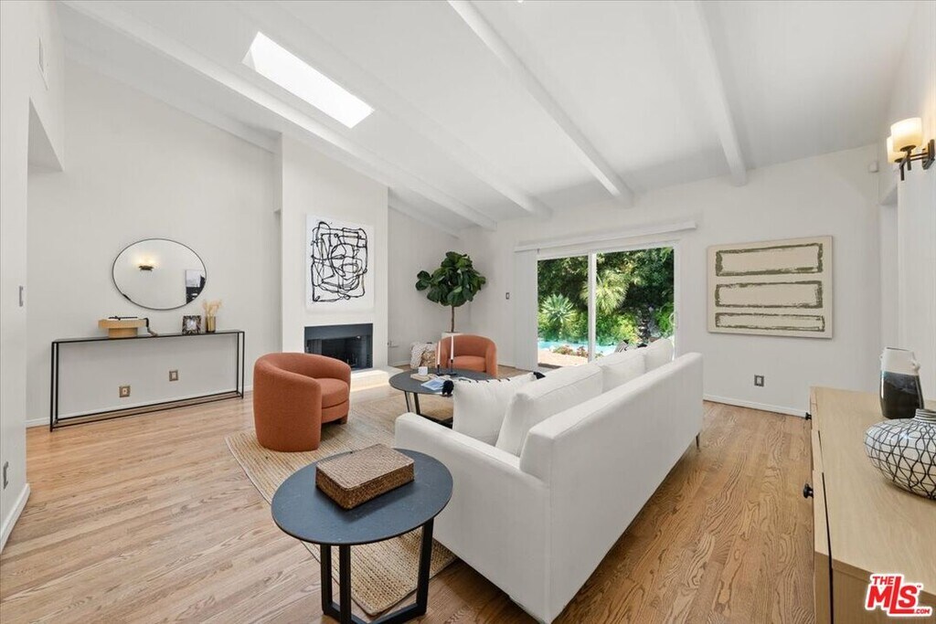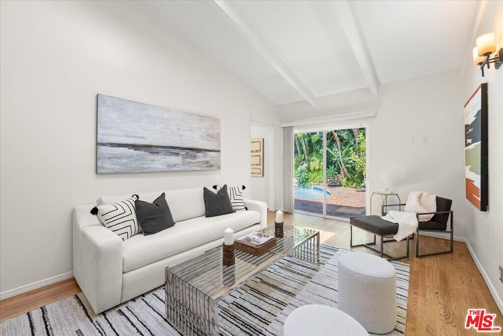 Tranquil and Spacious 3 bedroom, 2.5 bathroom home, located in one of the finest areas of Brentwood, North of Sunset. Living room, primary bedroom, den/family room off of the kitchen, all face a private backyard with a heated pool and lush landscaping. There are two other additional bedrooms with a shared bathroom. The primary bedroom has a spa bath tub and separate stalled shower. The large kitchen features built-in appliances and connects to the laundry room leading to an attached garage. The living room has a fire place and skylight. Additional features include newer central HVAC, recessed lightings, hardwood flooring and security camera system throughout. Lovely home for family style living and entertaining. MLS# 25604801