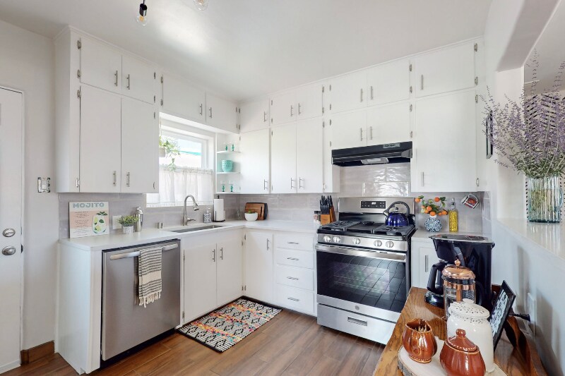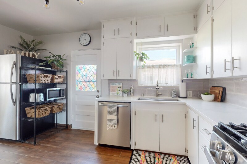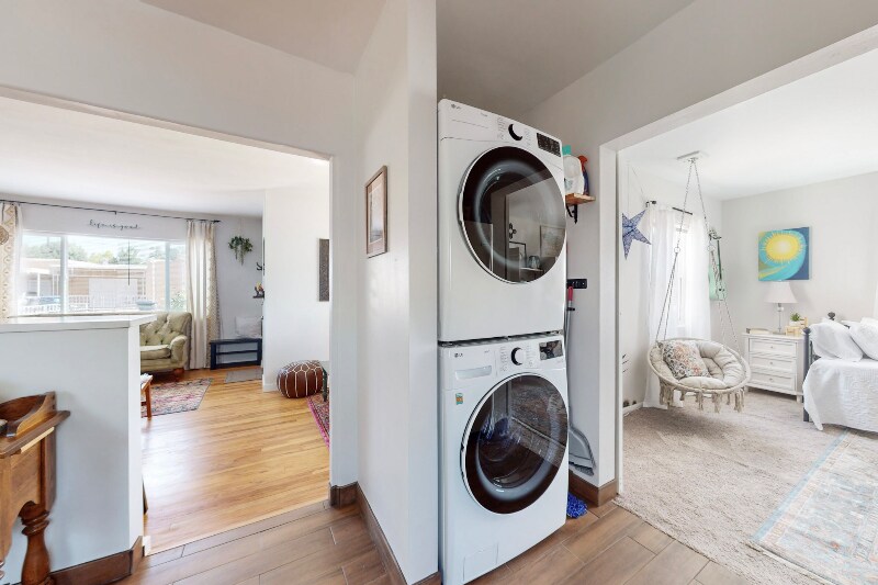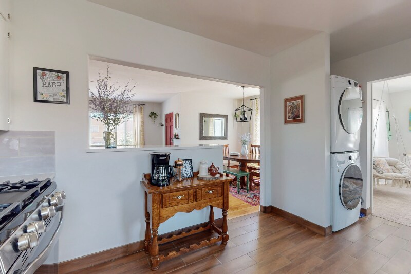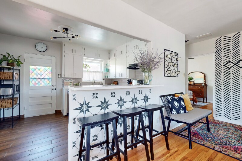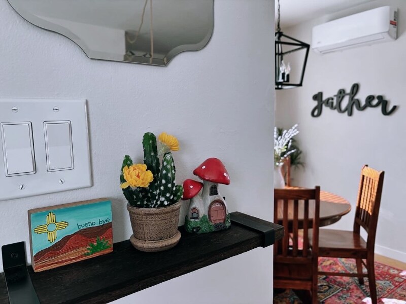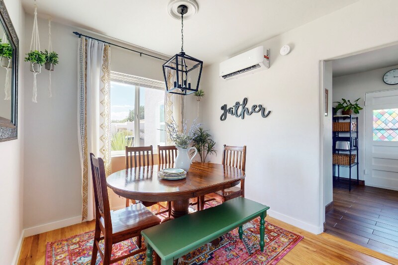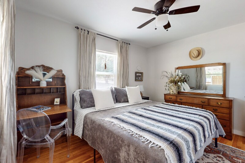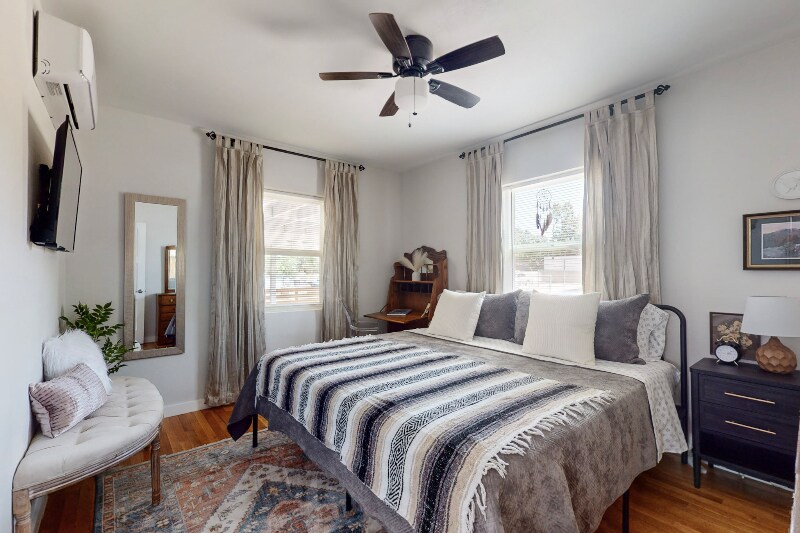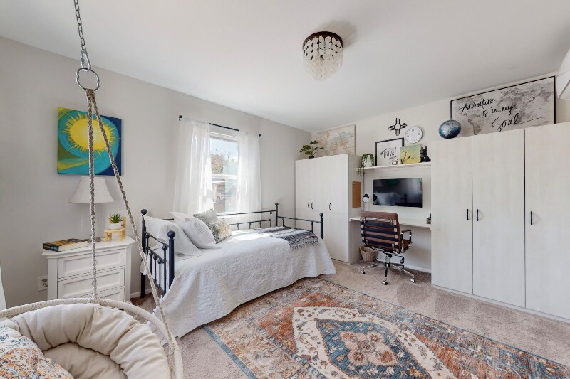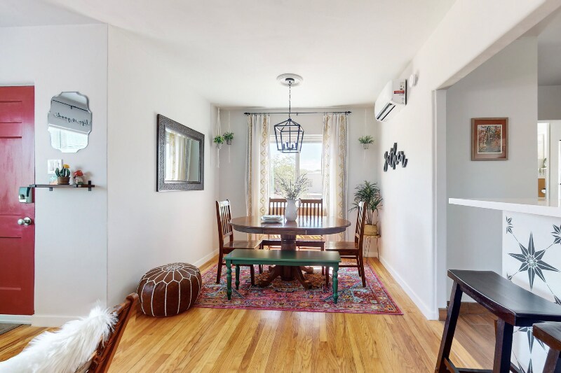 Property Id: 1359119 Please do not visit or knock on the door without prior approval. Exterior security cameras are installed for added safety. Discover a beautifully fully furnished 3-bed, 1-bath retreat blending style, comfort, and convenience. This modern residence combines Southwestern elements with bohemian charm. Nestled in vibrant Ridgecrest, offering urban living with tranquility. Amenities include high-speed WiFi, utilities, smart TVs, dishwasher, microwave, and more! Enjoy an open-concept living space, eclectic decor, fully equipped kitchen, king and queen bed suites, a bonus room with a workspace/daybed, and a private backyard patio with a special area for furry companions. Perfect for corporate travelers, nurses, remote workers, couples, families, and solo adventurers. Off-street parking, washer/dryer, and a fenced yard included. 5 mins to KAFB, Sandia Labs, UNM, Nob Hill, Sun Port, Hospitals, and 15 mins to the Movie Studios. Don't miss the chance to call this Southwestern retreat home!