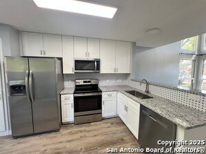 Welcome to this beautifully updated 3-bedroom, 2 1/2 bath duplex, offering modern upgrades, comfort, and convenience.This home features an open-concept layout with brand-new flooring, fresh paint, lighting, and designer finishes throughout. The kitchen boasts stainless steel appliances, granite countertops, and new cabinetry - perfect for cooking and entertaining.The primary suite includes a private bath with a walk-in shower, while the two additional bedrooms provide flexibility for guests, family, or a home office. Both bathrooms feature modern fixtures and stylish tile work. Residents enjoy access to community amenities including a swimming pool, tennis courts and well-maintained outdoor areas. The home is also conveniently located next to McCallister Park and near major freeways.