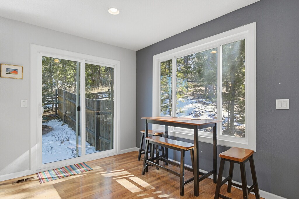 Manor House Properties- Enjoy peaceful mountain living in this beautifully updated 2-bedroom 1-bath rental nestled on 1.65 private acres in Conifer. The open-concept upper level features engineered hardwood floors, abundant natural light, and an updated kitchen with wood cabinetry, stainless steel appliances, slab granite countertops, and an induction range. A pellet stove adds warmth and character. Step outside to the covered composite deck with recessed lighting and enjoy wooded and mountain views with frequent wildlife sightings. Conveniently located just 20 minutes from C-470 and 0.8 miles off Highway 285. The home includes a stocked kitchen with an induction range and cookware provided, shared washer and dryer, forced air heat plus a pellet stove, driveway parking, and electric included. Tenant is responsible for internet and trash service. TENANT HAS THE RIGHT TO PROVIDE A PORTABLE SCREENING REPORT IF LESS THAN 30 DAYS OLD. This rental is the upper level only. No Smoking. Pets negotiable. First, Last and Security Due.