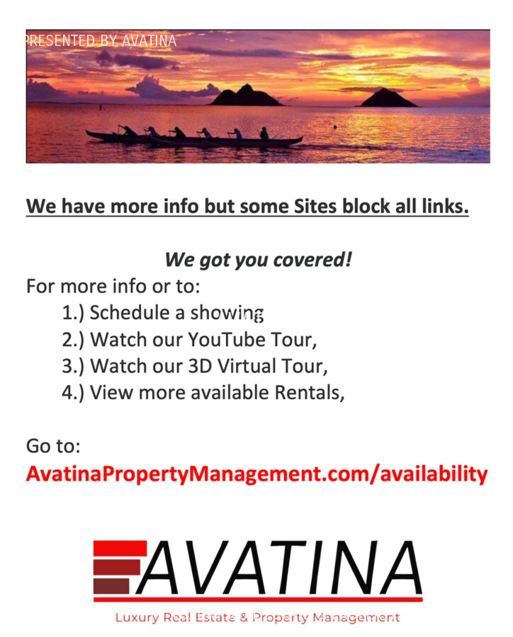 Beautiful 3-bedroom, 1.5-bath pet friendly classic Kailua home with a spacious and flexible floor plan. Enter through the front living room with charming built-in seating, flowing seamlessly into a second family room that opens to a large backyard—perfect for indoor-outdoor living. The cozy kitchen features a breakfast nook ideal for casual dining. The primary suite offers a private en-suite half bath, split AC and full-size closets. Down the hall are two additional bedrooms each with split AC and full-size closets. Both with lots of light and overlook the backyard and share a convenient hall bathroom. Inside you’ll find fresh paint, laminate flooring, and A/C units for modern comfort. Step outside to enjoy a wonderful covered patio, mature mango tree, and generous yard space—landscaping is included. There is a huge garage with an attached covered laundry area that includes a full size washer and dryer. Inside the garage has plenty of storage and great light. Parking is easy with our long driveway plus ample street parking available! Located on the desirable Keolu Hillside, just minutes from Enchanted Lake Shopping Center, movie theater, and everyday conveniences. Approximately 2 miles to Kailua Town and 3 miles to world-famous Kailua Beach. Video: Just listed - coming soon! 3D Tour: Just listed - coming soon! Property Details: You can view properties and schedule showings at: Or call: Or call: (8O8) 645-449O - Address: 1223 Manulani St Lease Terms Rent: $4,995/month Lease: 1 year Deposit: $4,995 (due at signing) Monthly Fee: $15.50 (Liability to Landlord Insurance & Credit Reporting fee) Fees Application: $50 Onboarding (one-time, upon approval): $100 Utilities & Services Tenant pays all utilities Landscaping included Renters insurance required Policies No smoking or vaping Pets allowed with approval $500 deposit + $100/month per pet Presented by AVATINA | RB-23233 Landscaping Service Tenant Pays All Utilites.