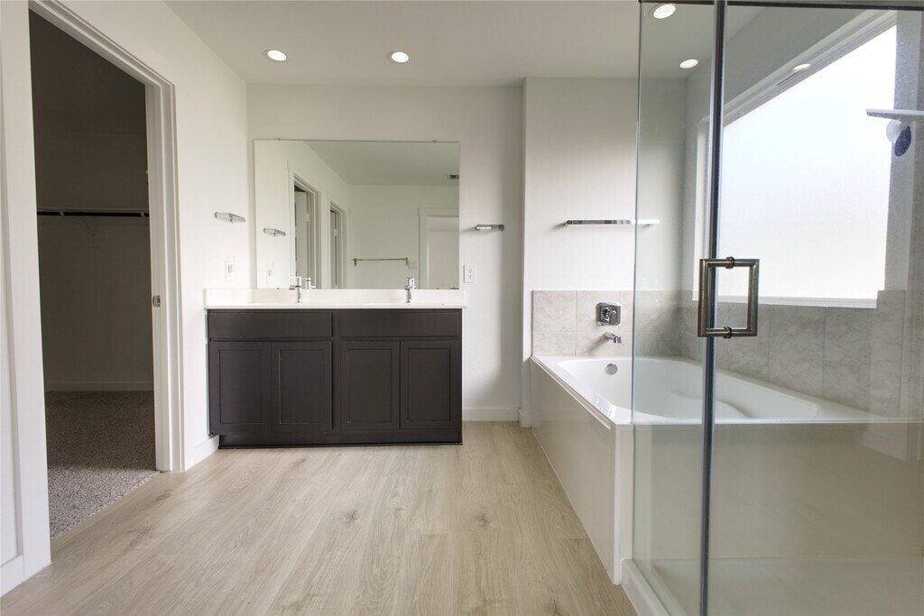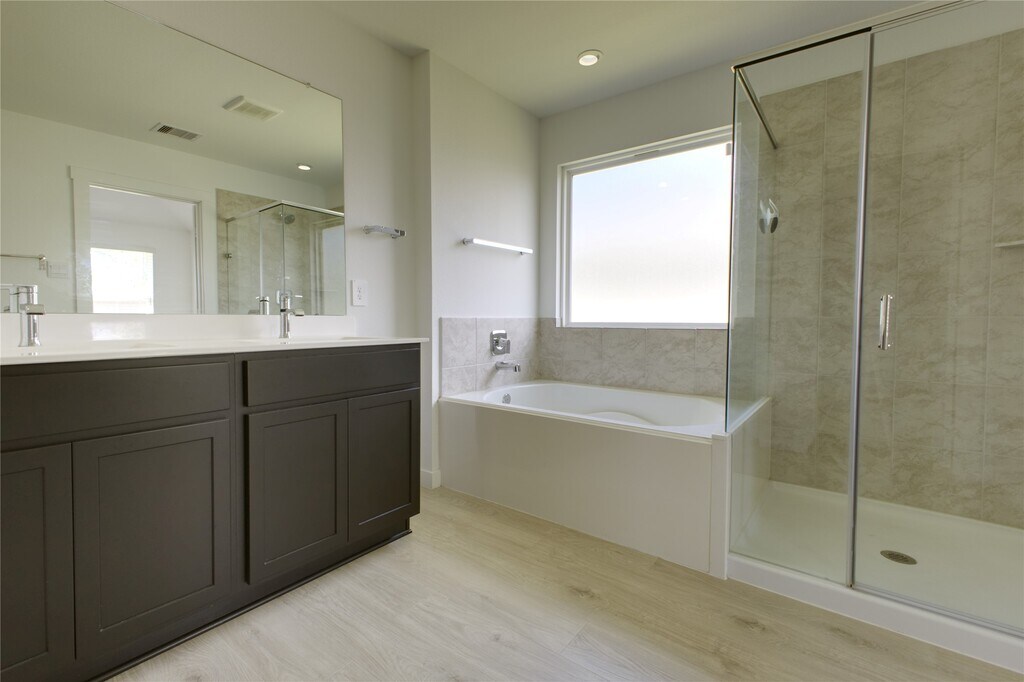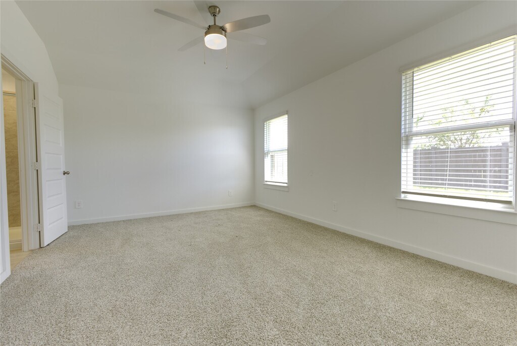 This elegant single-story Gaven floor plan features four spacious bedrooms,two full bathrooms,and an attached two-car garage. Upon entry,you are welcomed by a coat closet and two guest bedrooms adjacent to a well-appointed full bath with a linen closet in the hallway. The kitchen boasts a breakfast bar with pristine white Silestone countertops,sleek black cabinetry,stainless steel appliances,and a convenient corner pantry,seamlessly connecting to the expansive combined dining and family room. An additional bedroom is situated near the common living area. The primary suite impresses with a vaulted ceiling,dual vanities,a private water closet,and a generous walk-in closet. The rear covered patio,accessible from the family room,provides an ideal space for relaxation and entertaining. Throughout the home,you’ll find durable Nimbus Oak luxury vinyl plank flooring and plush Silver Dollar carpeting. MLS# 54025742