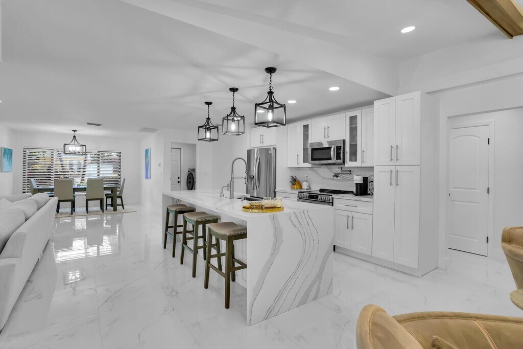 Step into timeless elegance with this fully renovated 3-bedroom, 2-bathroom pool home in the coveted neighborhood and best location in Boca. Designed for modern living, the open-concept layout seamlessly connects the living, dining, and kitchen spaces--perfect for both relaxation and entertaining. Natural light floods through expansive impact windows and doors, creating an airy, welcoming ambiance. The gourmet kitchen boasts sleek quartz countertops, custom cabinetry, and top-of-the-line stainless steel appliances. Outside, enjoy your private tropical oasis with a sparkling pool, lush landscaping, and plenty of room for gatherings.