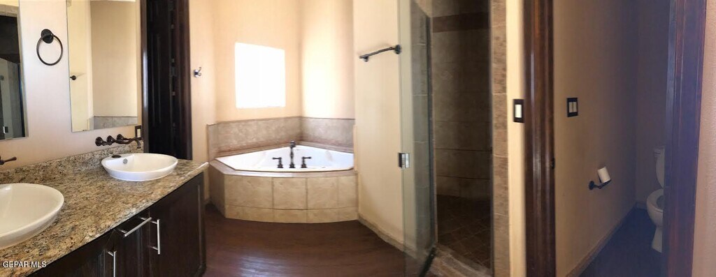 A unique home with amazing features! This home is located on the Eastside of El Paso and is part of a gated community right off of Zaragosa. Enter into an expansive family room with fireplace. Kitchen is open to the family room and features granite counter tops,ample cabinet space and is equipped with refrigerator and stove/oven. Upstairs are 3 bedrooms including the master bedroom with private bathroom. This luxurious bathroom has a walk in shower and a jetted tub. Bronzed fixtures throughout the home give an elegant feel to this home.