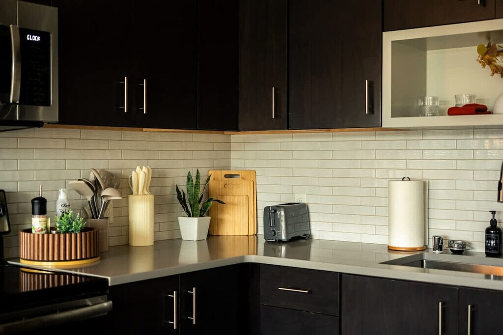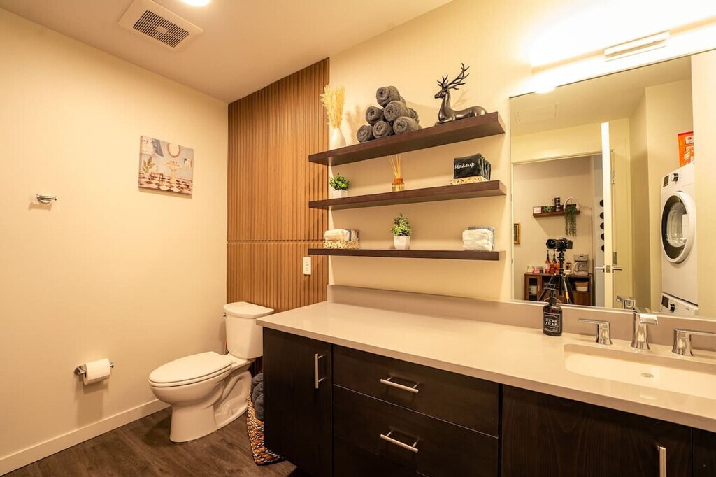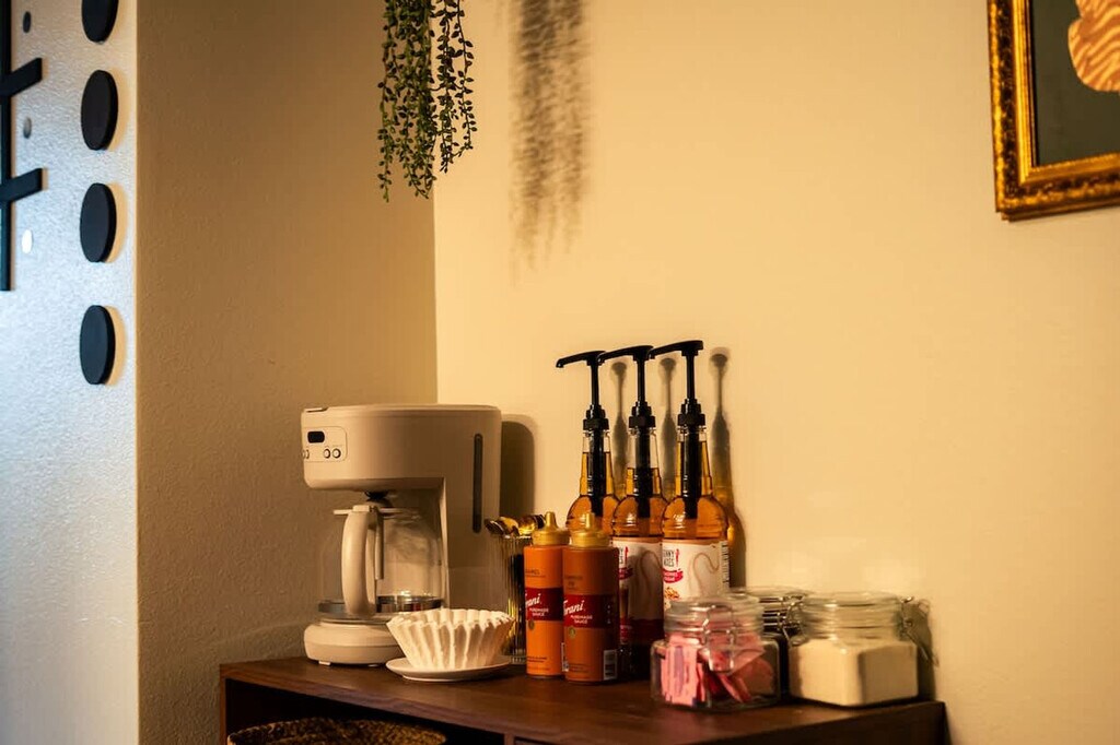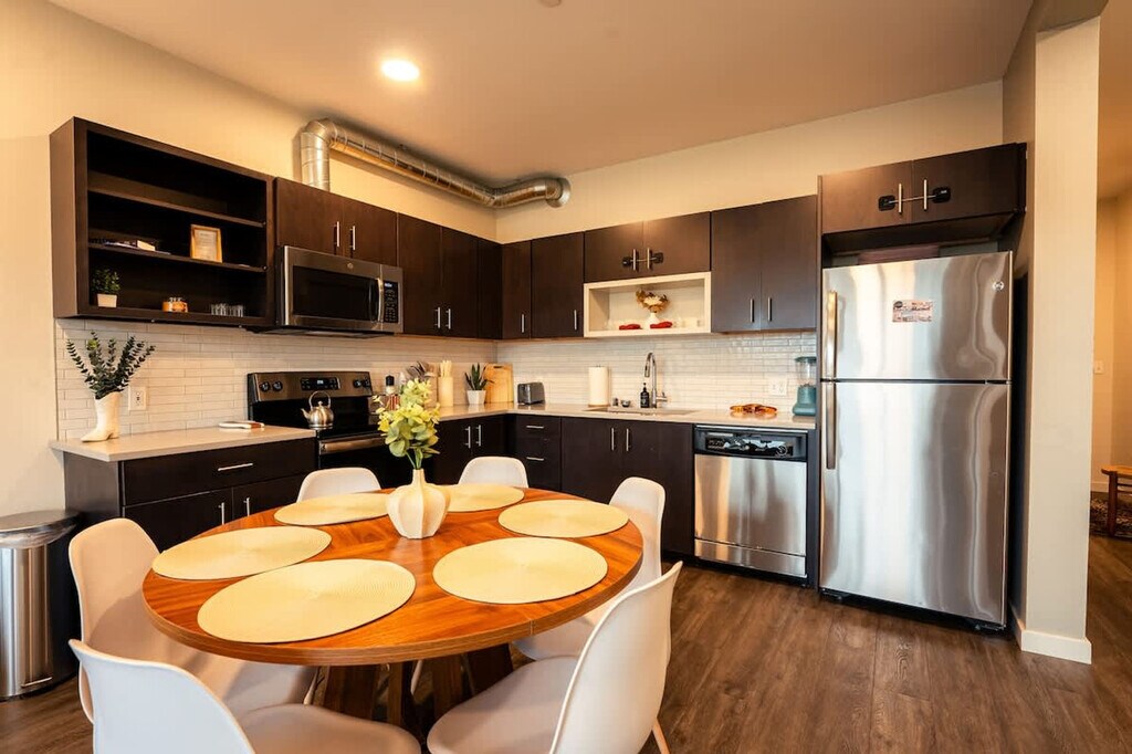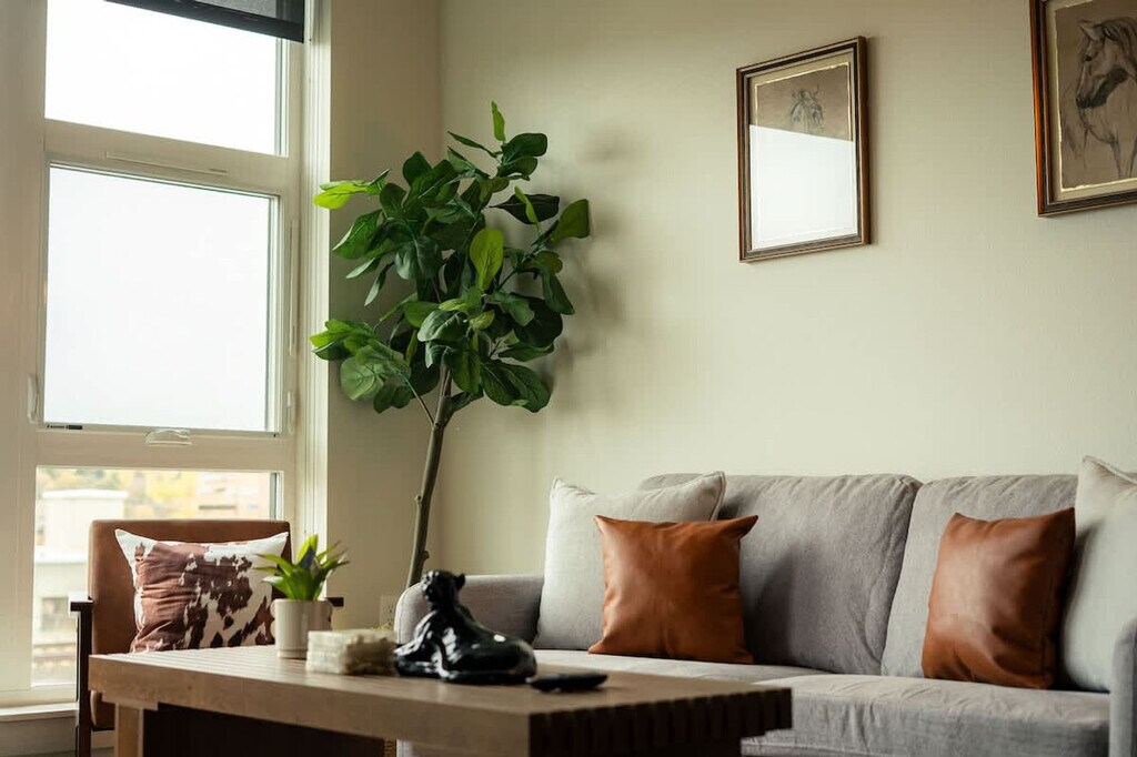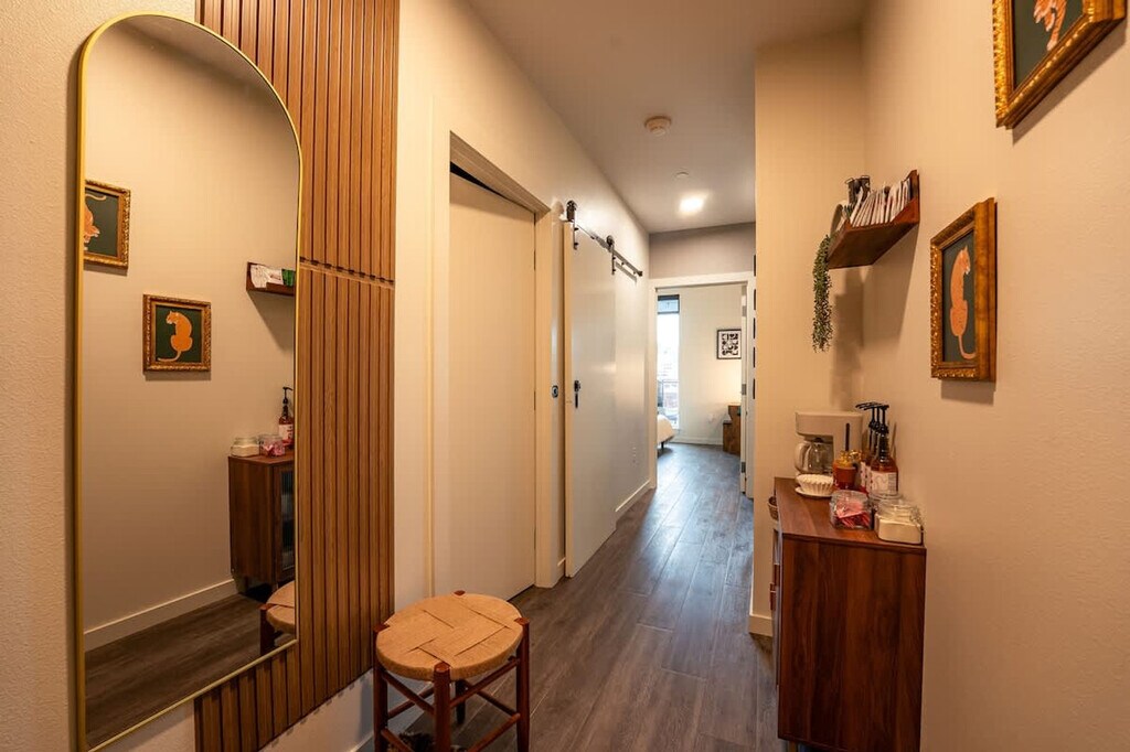 Feel at home in this cozy western escape in the Downtown Drift. Start your mornings with the glow of the city skyline right from your bed, as large picture windows showcase a beautiful city view and the distant sound of the passing train adds a touch of charm. This warm and inviting space features a stylish modern entry area. The first bedroom welcomes you with a cozy queen-size bed dressed in warm, neutral tones. You'll find a cute little coffee station stocked with a variety of options, including tea, coffee, and hot chocolate. The second bedroom offers modern western charm and comfort, with a large window that fills the space with natural light and overlooks the balcony, offering a peaceful view of the city and the passing train. The living room features a spacious dining area and a full kitchen, ideal for cooking or baking your favorite treats. Relax on the comfortable sofa, enjoy a movie on the TV, or simply take in the stunning view from the large picture window showcasing the city skyline and train below. Step out onto the balcony to unwind and soak in the city atmosphere. Early check-in or late check-out is available upon request for $30 each, depending on availability. Guests have the option to pay a daily fee of $5 for the gated parking provided. Pets are welcome for an additional fee already included in the price. This apartment is ideally located to enjoy the city vibes. A $500 fine will be charged for smoking or vaping inside the apartment. Please respect quiet hours from 8 PM to 7 AM. A $200 replacement fee will be charged for lost or damaged gate remote. A $50 replacement fee will be charged for lost or damaged parking tag. Hosting parties or events is strictly prohibited and will incur a $500 fine. Engaging in illegal activities on the premises will result in immediate eviction and a $1,000 fine. Any damage caused to the apartment or its contents will be charged at replacement cost, plus a $300 damage fee. Hanging items from balconies is prohibited. [SI]