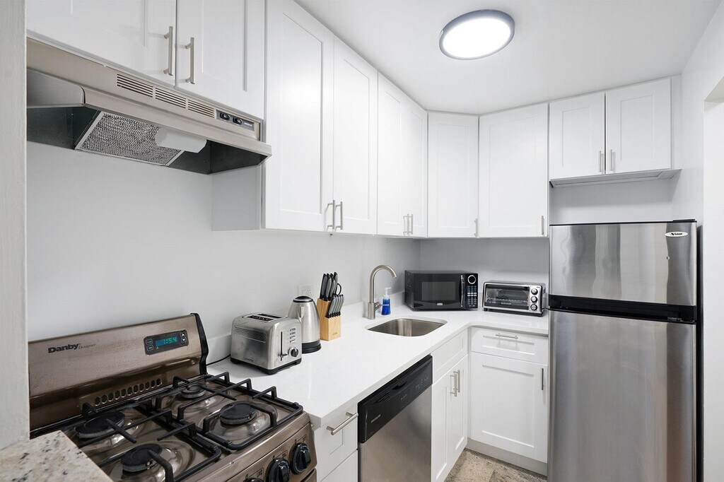 Start living in this contemporary 1-bedroom, 1-bathroom fully furnished apartment located on the 3rd floor of an elevator building. Feel at home with its sophisticated living room and bedroom, complemented by parquet wood flooring and spacious closets. The apartment features a fully equipped kitchen with modern finishes, including countertops, appliances, and a dishwasher. Enjoy meals at the dining table that seats four, and relax in the living room with a comfortable sofa and a flat-screen TV with basic channels. Wireless internet is also available for your convenience. The apartment includes access to wireless internet and a flat-screen TV with basic channels for entertainment. This apartment is ideally situated, offering easy access to local amenities and attractions. With its central location, you'll find everything you need within reach. A laptop computer is not included, and the apartment follows a no-smoking policy. The apartment is equipped with wireless internet, making it suitable for remote work-friendly set-up.