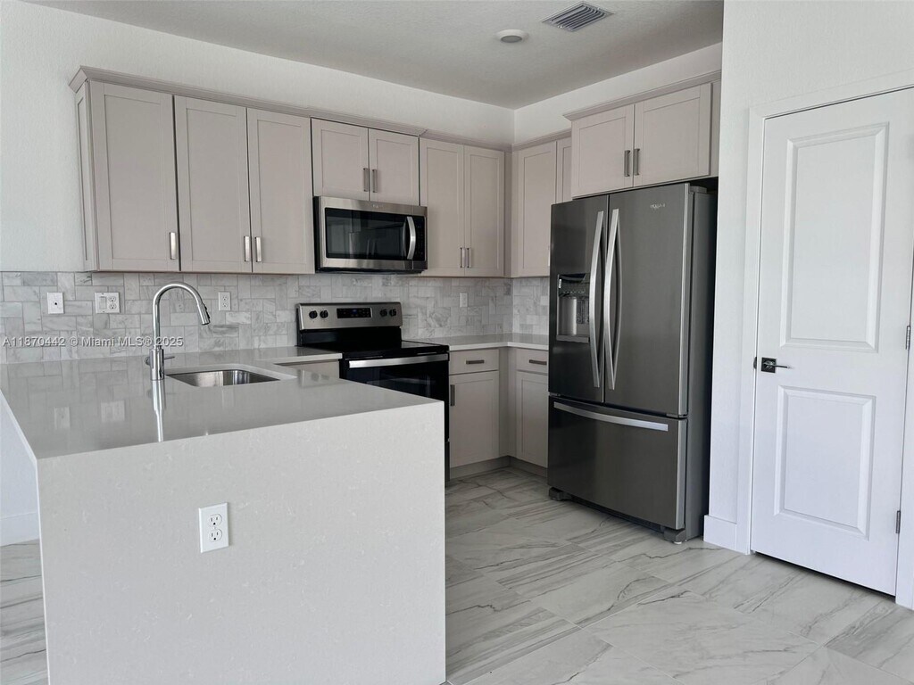 Immaculate Wesley model 4BR/3BA corner townhouse in the highly sought-after Merrick Square community! This modern residence features an open floor plan with a full bedroom and bath on the first floor, ideal for guests or multigenerational living. Upgraded throughout with quartz countertops, waterfall kitchen island, subway tile backsplash, porcelain tile flooring, frameless glass showers, and smart home technology. Kitchen includes Whirlpool stainless steel appliances, plus washer & dryer for convenience. Located in a gated community near top-rated schools, shopping, and dining. Move-in ready—schedule your private showing today!