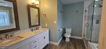 Spectacular colonial located on a cul-de-sac on approximately 0.3 acres. Over 4,775 finished sq ft on three levels. Upper level features two primary suites with custom luxury full baths, plus two additional bedrooms and two full baths. Primary bathroom has heated floors! Hardwood floors in upper hallway and convenient upper-level laundry. Main level offers hardwood flooring, 9 ft ceilings, crown and chair molding, formal living and dining rooms, spacious family room, and gourmet kitchen with stainless steel appliances, 6-burner cooktop, built-in microwave, double wall ovens, and a breakfast room. Fully finished walk-out lower level with bamboo flooring includes large recreation room, office/den, exercise room, full bath, storage, and utility room. 2-car garage with charger for electric vehicle, fenced backyard
