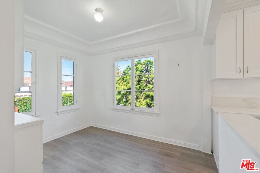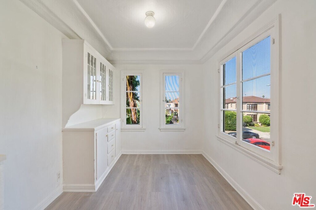Welcome to this bright and spacious upper duplex unit filled with classic Spanish charm, centrally-located in Wilshire Vista. Positioned on the 2nd floor, enter into the expansive main living room flooded with natural light, complete with a decorative fireplace and tray ceilings. Continue seamlessly into a large designated dining room, which leads into a generous-sized, newly-updated kitchen with a separate breakfast nook with original built-ins. Off the kitchen, find a dedicated laundry area with W/D appliances and access to a set of stairs down to the shared backyard. The hall atrium boasts built-ins, a linen built-in and a cedar closet for your coats. The sizable primary suite is complete with high ceilings, a walk-in closet and an en-suite bath. The 2nd bedroom has 1 closet and a storage closet. 1 uncovered parking space is included with shared access to backyard. Tenant pays renter's insurance, gas, electricity, trash, cable/internet. MLS# 25593155
