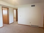 Split level duplex in Edgerton. The upstairs has the living room, a dining room/kitchen area with an island, a carpeted bedroom, and a bathroom. Downstairs there is a den with a gas fireplace, two carpeted bedrooms, and a bathroom. The unit has a two-car attached garage and driveway. The building was built in 2005 and is right next to Friends of Edgerton Dog Park. Washer and dryer hookups in the unit.